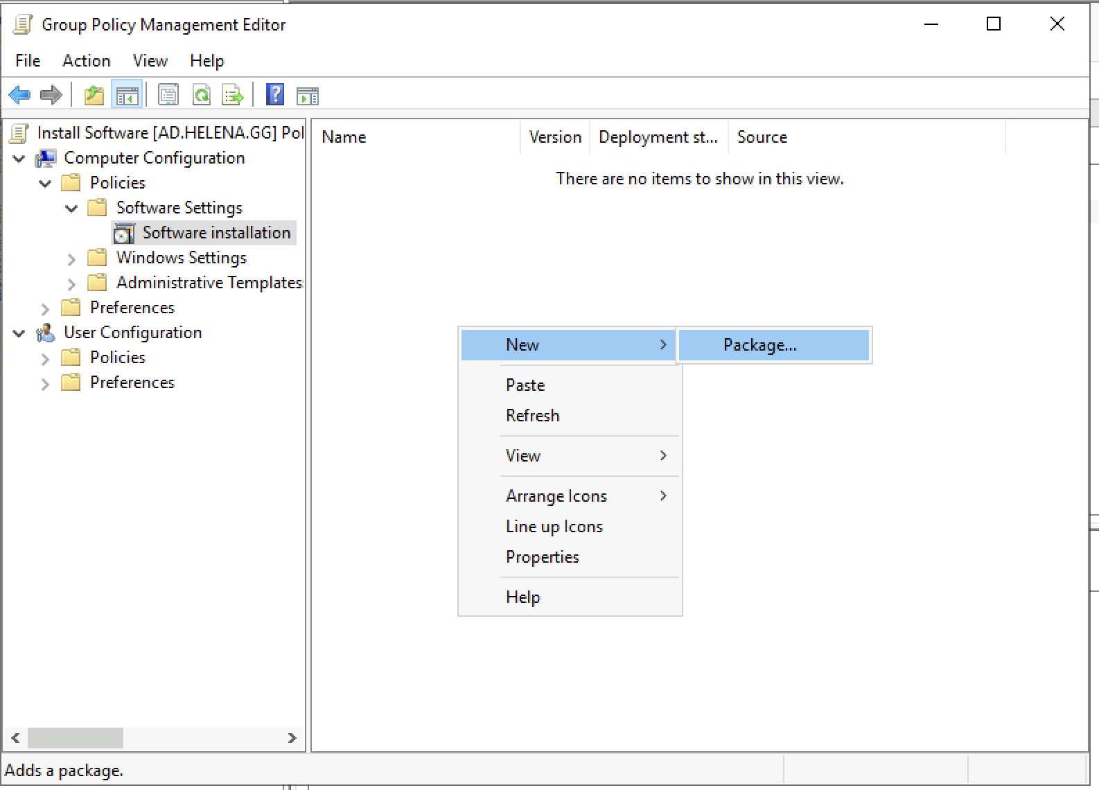 Open Policies » Software Settings » Software Installation, select New » Package