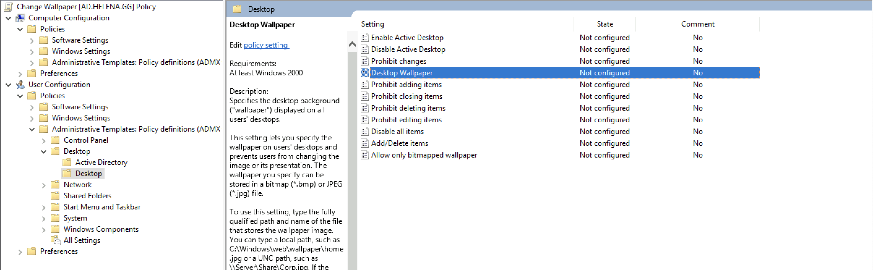 On User Configuration » Policies » Administrative Templates » Desktop, select Desktop Wallpaper