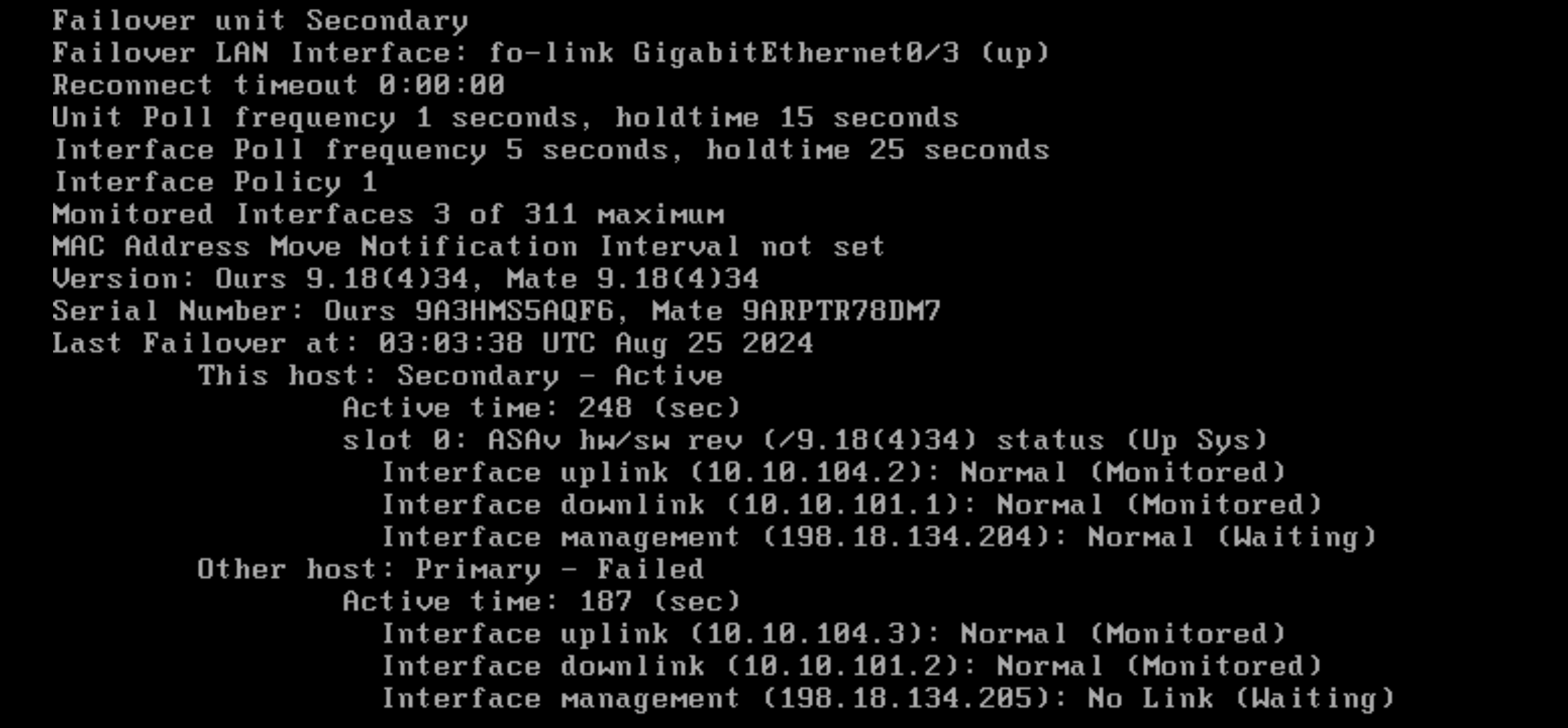 Running “show failover” shows that the secondary is indeed the active node