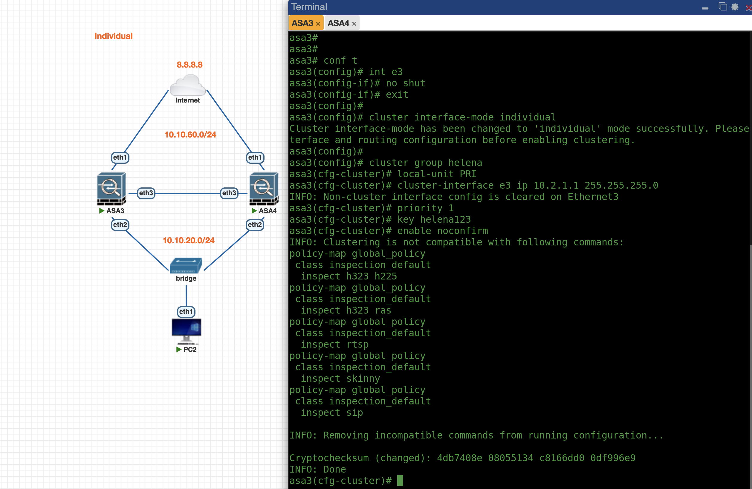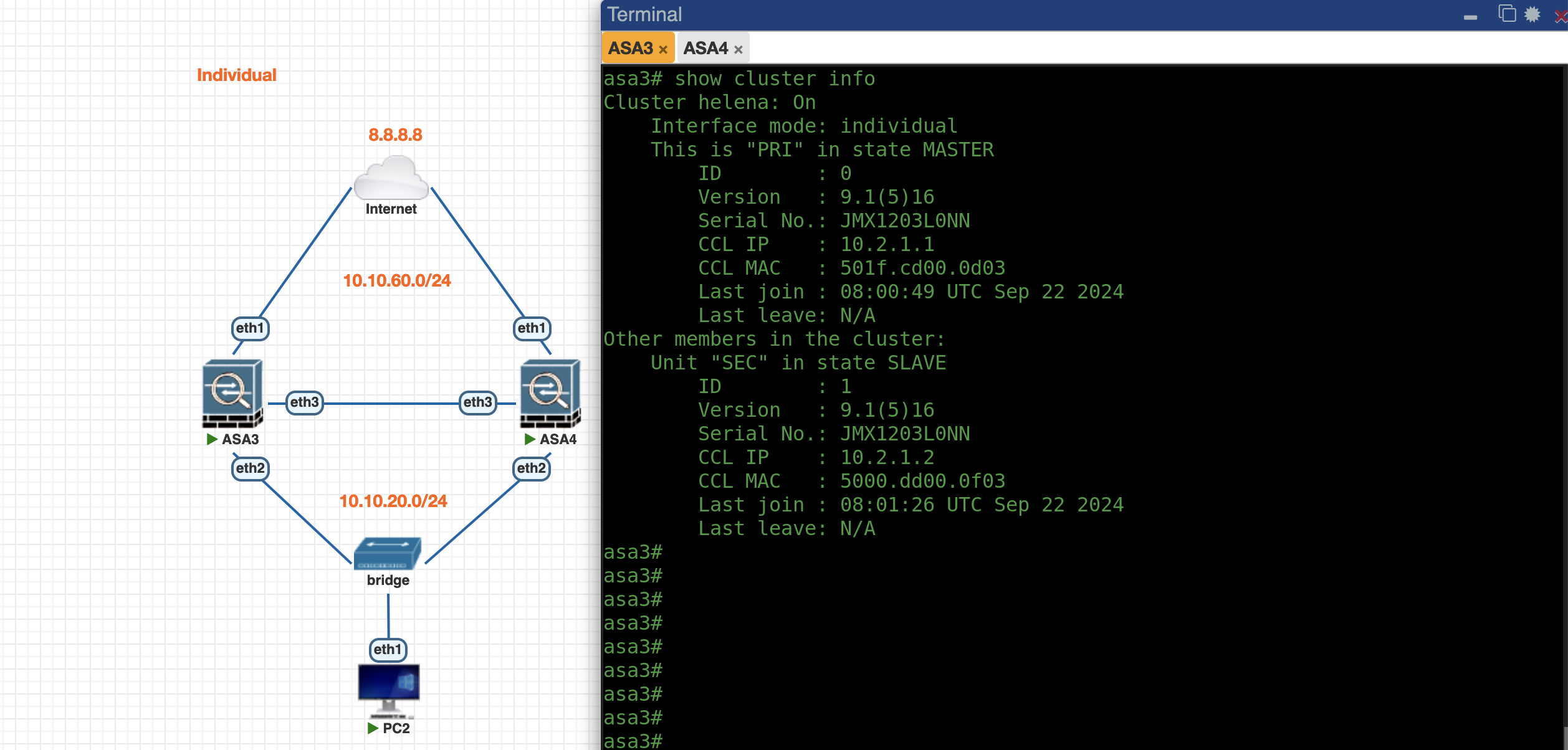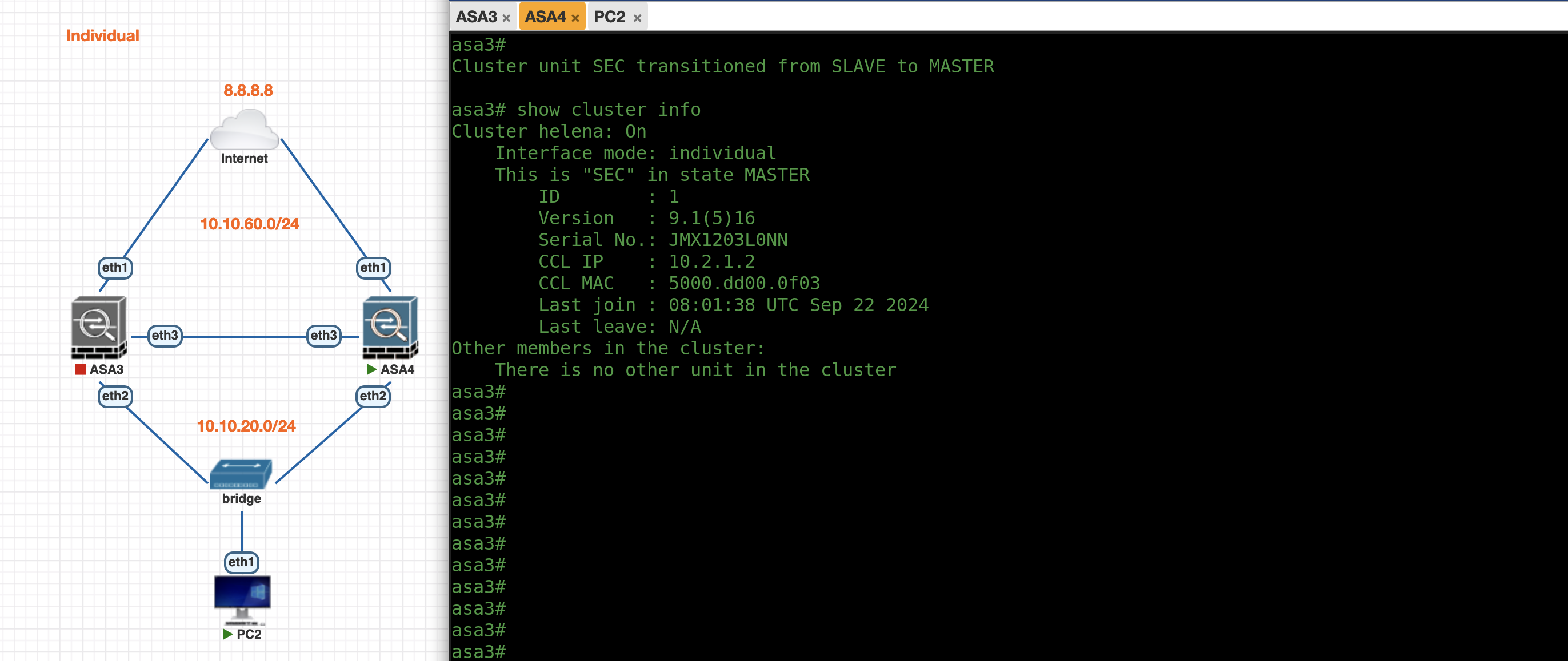First lets enable Individual Mode Cluster on ASA3, the config is pretty much the same as previously