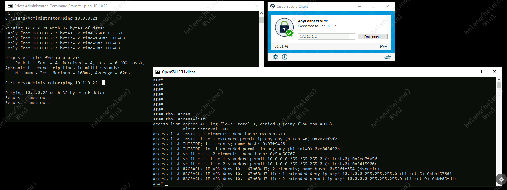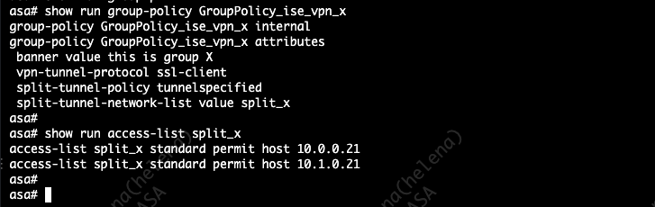 When we connect to the VPN, we get the ise_vpn_x Group Policy, we can also see we get some very specific routes because of the specific split tunnel ACL
