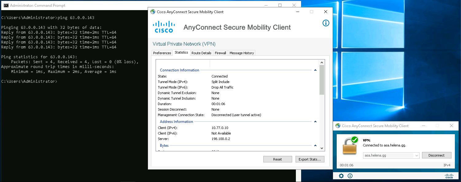 We’re able to ping the inside network, and on statistics we can see the details of the VPN connection