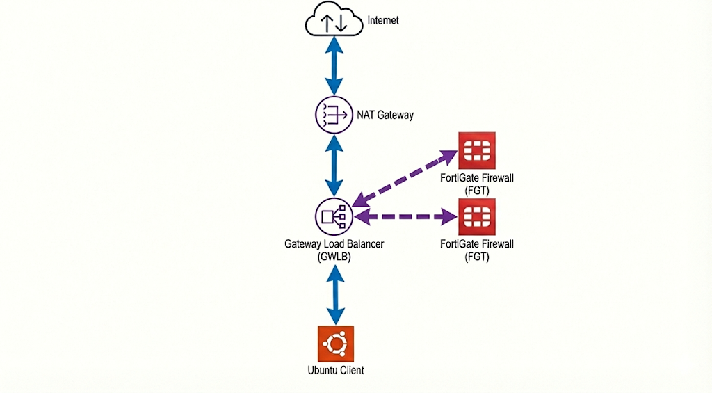 This lab implements a scalable, transparent inspection architecture by integrating AWS Gateway Load Balancer (GWLB) with FortiGate firewalls. We replace legacy Active/Passive NAT designs with a active-active fleet using GENEVE encapsulation with two standalone fortigate firewalls with identical configuration.