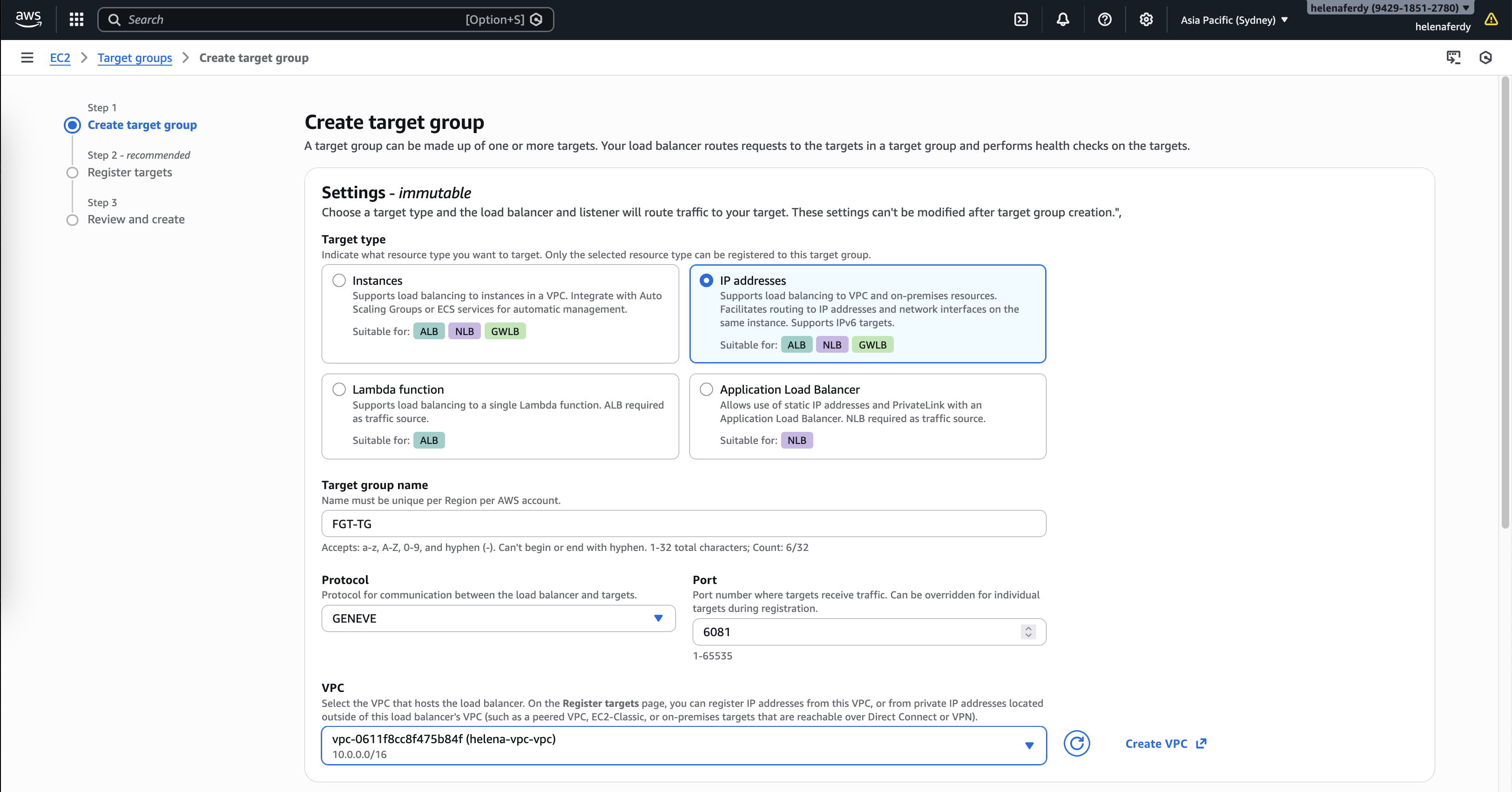Next we’ll create a Target Group, here we select IP Address with protocol GENEVE