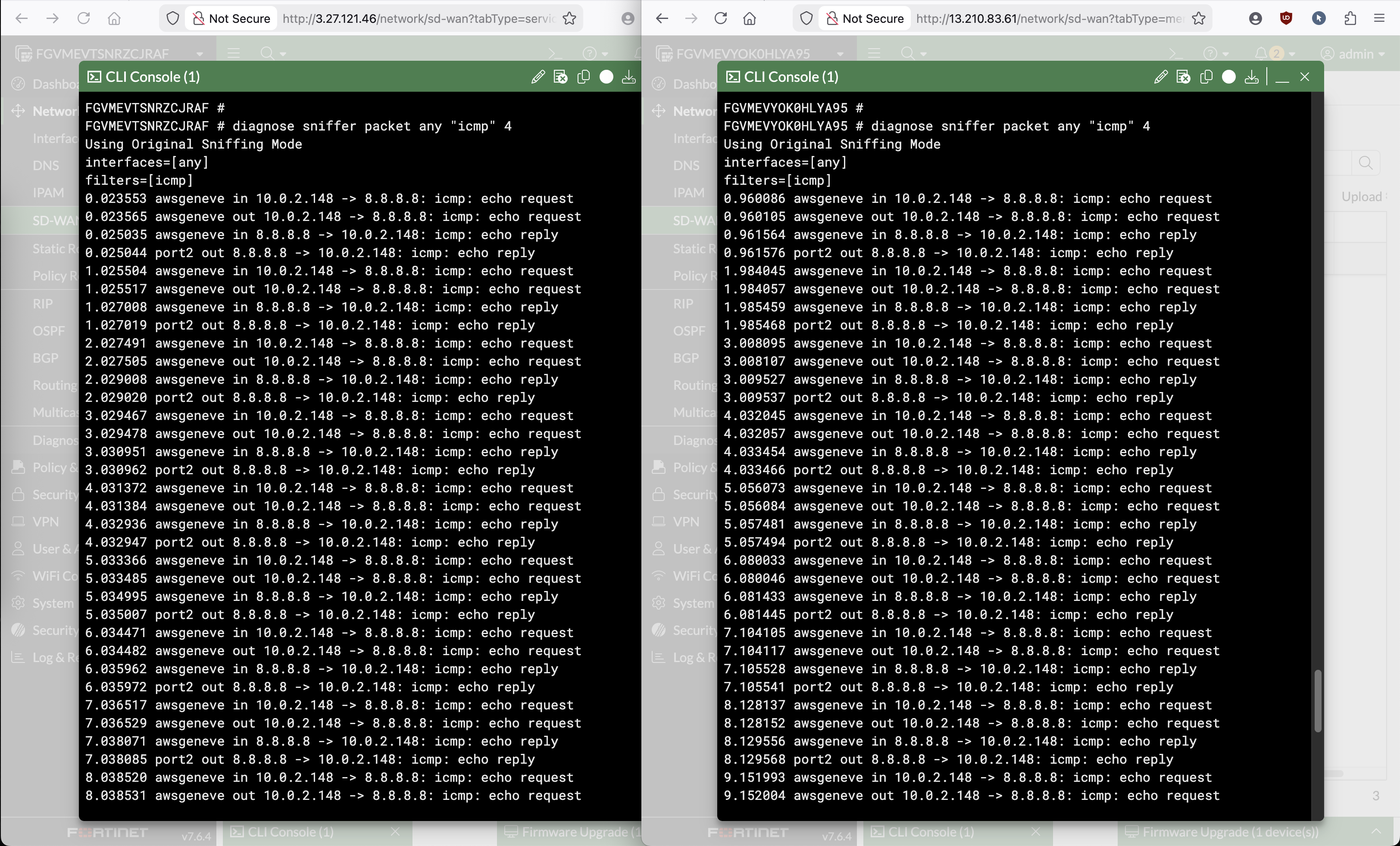 And if we put both Fortigate side by side, we can see that they both handle traffic in turn, thus confirming the load balancing is working