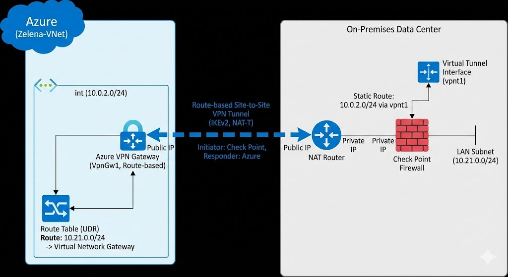 Azure Site-to-Site VPN provides a secure, encrypted bridge between a Virtual Network and on-premises infrastructure using the IPsec protocol suite. In this architecture, a Virtual Network Gateway (Route-based) serves as the cloud-side termination point, enabling private communication over the public internet.