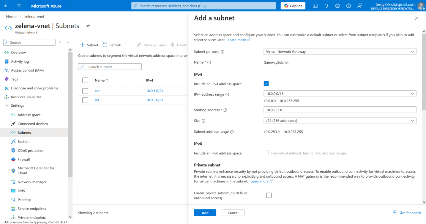 Azure requires us to create a dedicated subnet for Virtual Network Gateway, so here we create one on 10.0.253.0/24