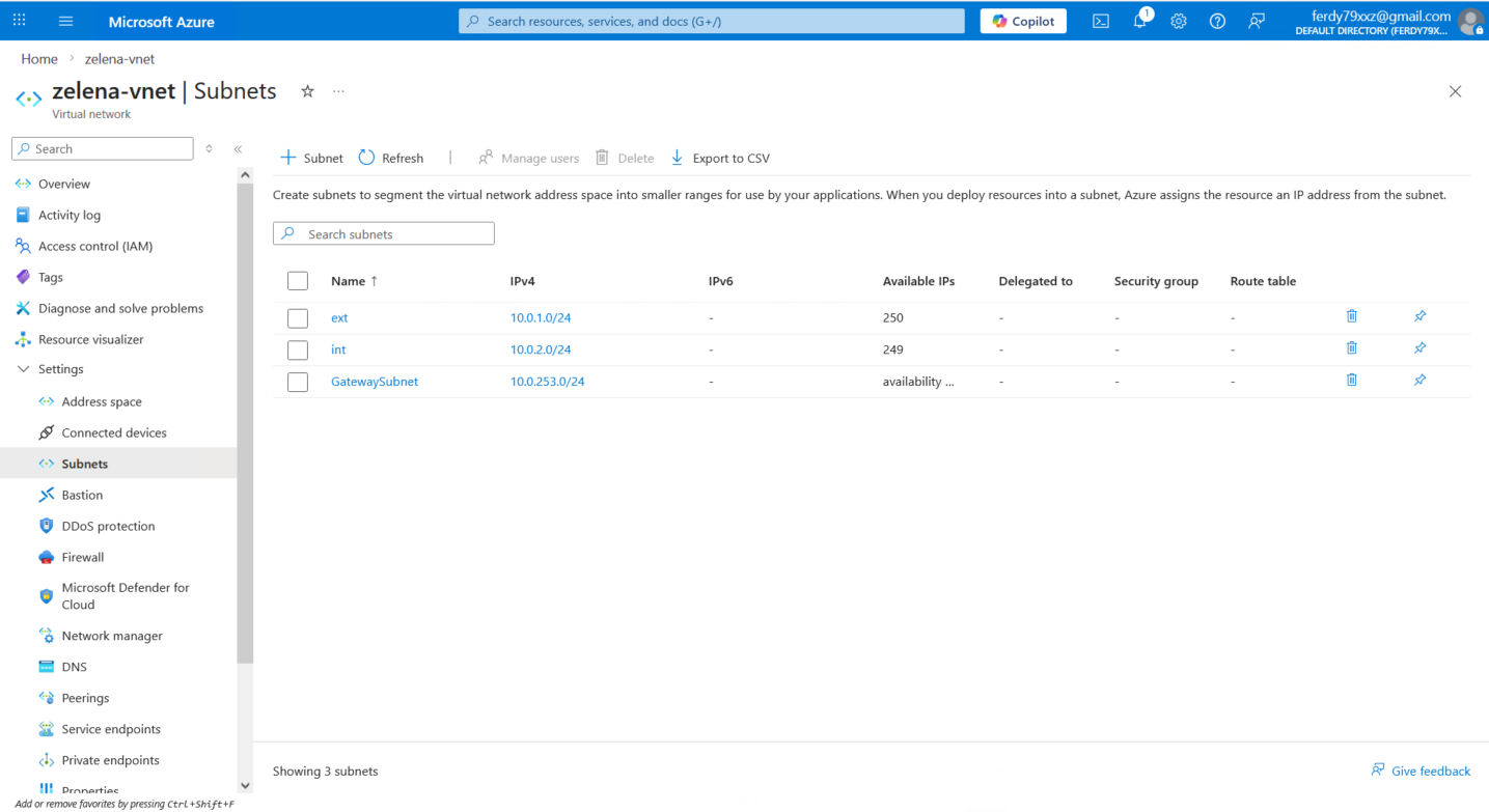 Here we already have zelena-vnet with ext and int subnets, we mainly will only use the int subnet (10.0.2.0/24) for this tunnel.