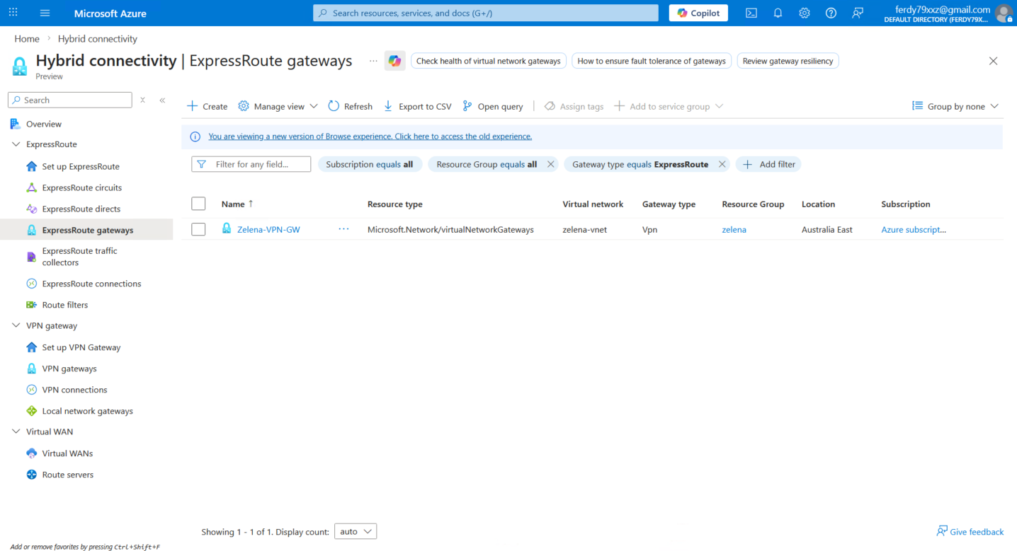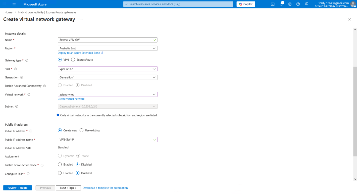 Here we name it Zelena-VPN-GW and assign the GatewaySubnet that we created earlier and provide new Public IP Address, we also disable active-active and BGP for simplicity