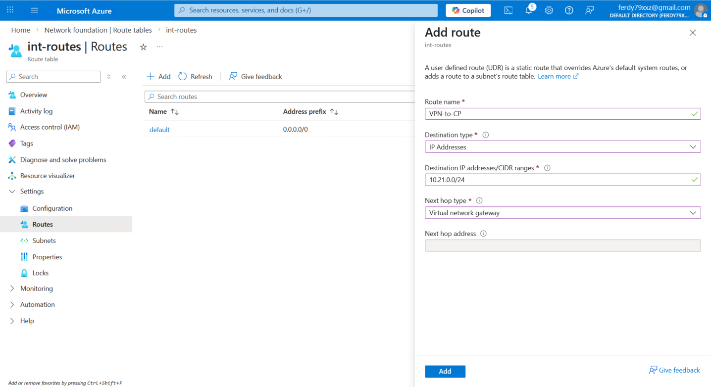 While we’re here, let’s also add a static route to steer traffic going to 10.21.0.0/24 to our Virtual Network Gateway (that we will create after this)