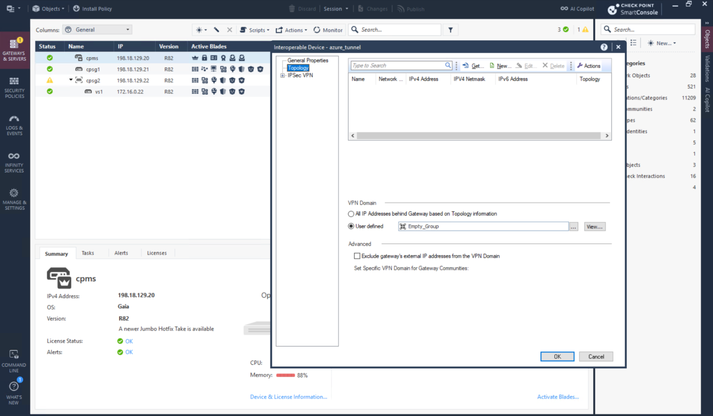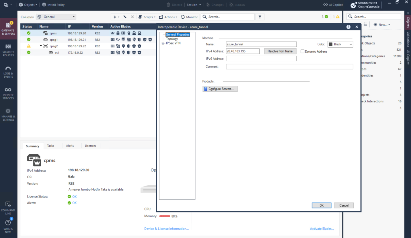 Now we configure the IPSec on the CP side, first we will create a new Interoperable Device pointing to Azure’s VPN Public IP