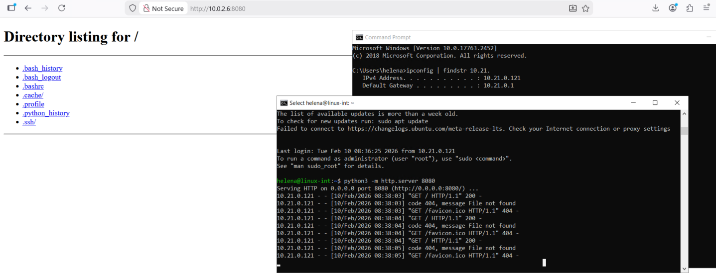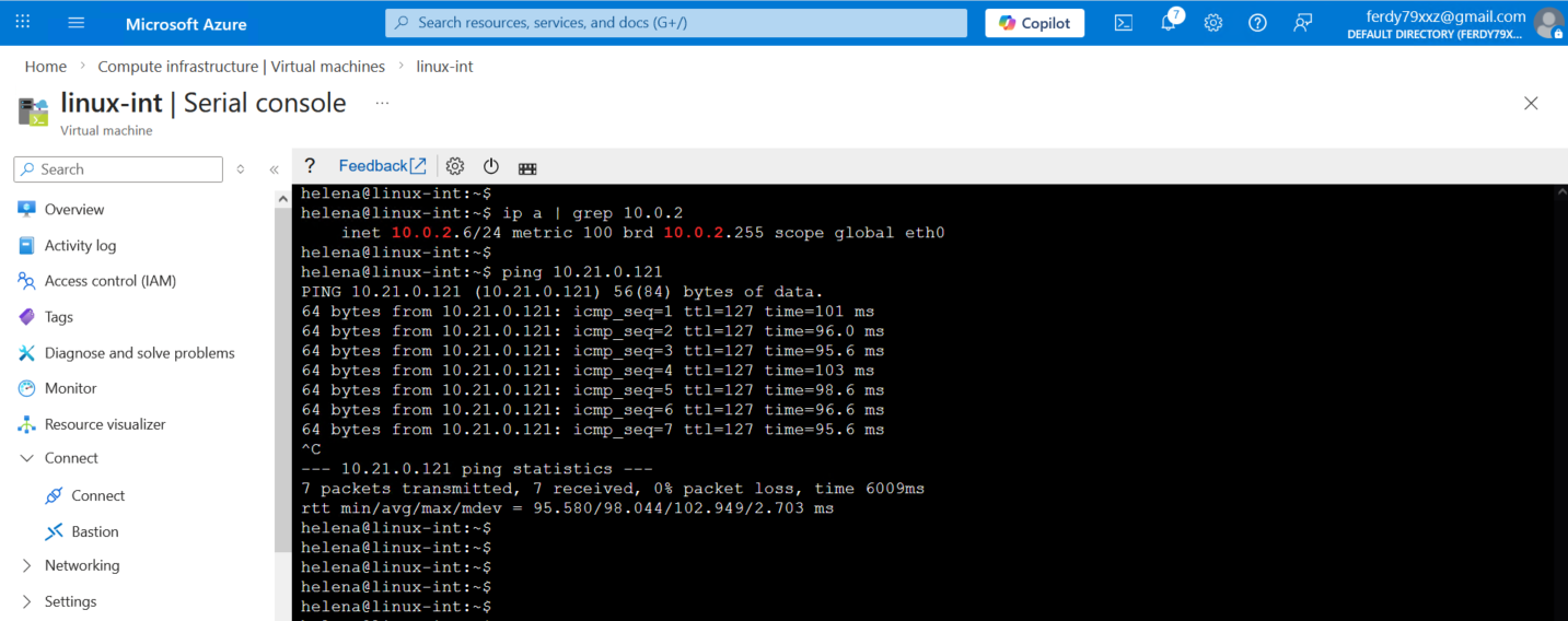 Testing the connection between the 2 subnets, here our Windows client (10.21.0.121) can ping, ssh and access web server on Azure’s linux host on 10.0.2.6