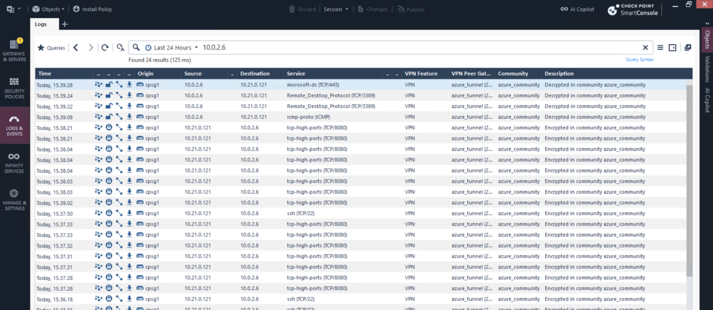The traffic is logged on our CP side verifying that the VPN connection is up and able to connect the 2 networks