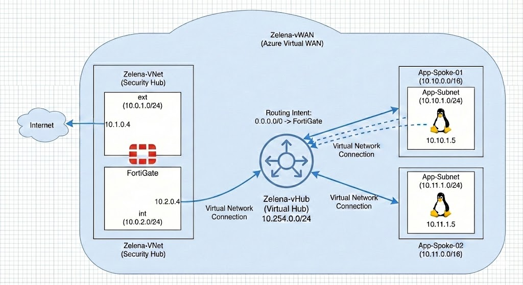 In this lab, we leverage this hub-and-spoke relationship to build a centralized security architecture. By connecting multiple application VNets to the Virtual Hub, we transform our FortiGate VM into an Egress Firewall. This setup ensures that every packet destined for the internet from any spoke is steered through the Fortigate firewall.