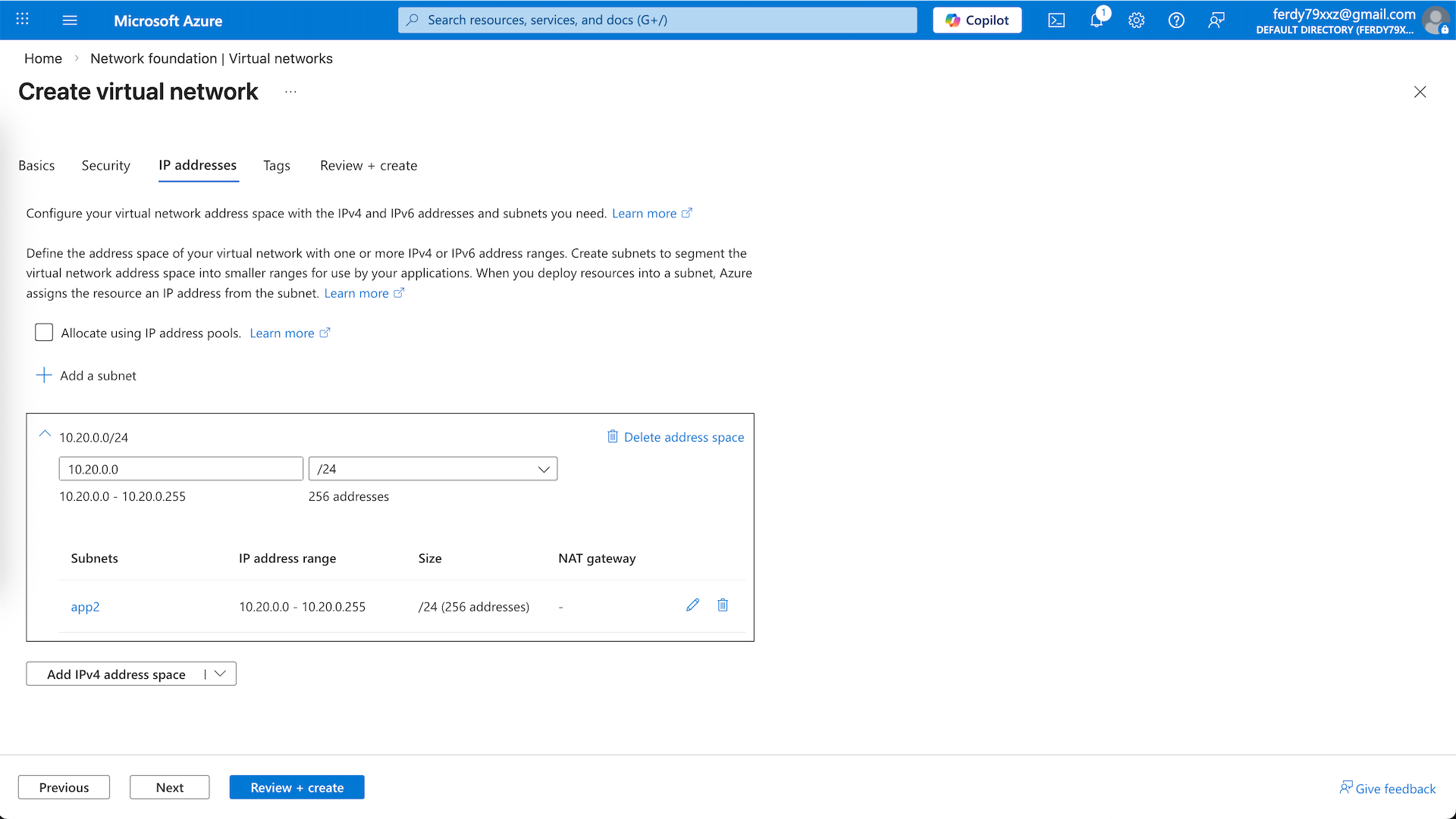 And the second one is app2-vnet on 10.20.0.0/24