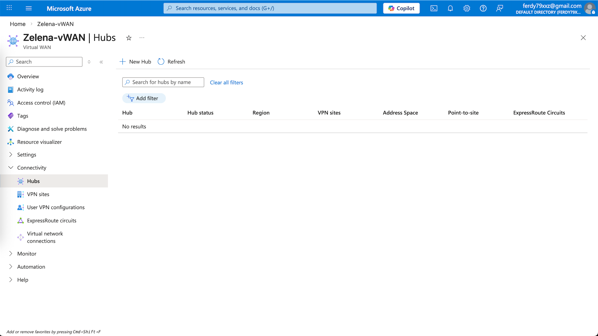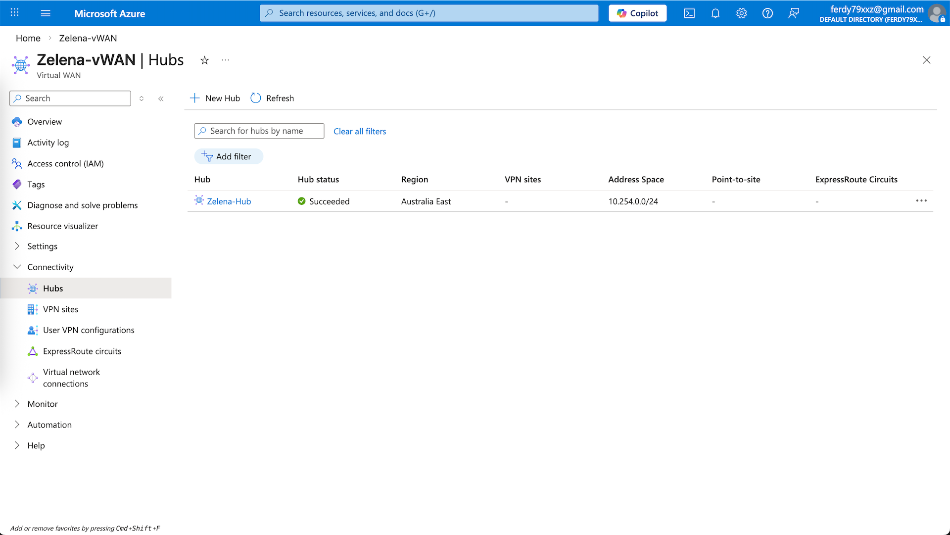 Enter the vWAN and select the Hubs. vHub is the core managed hub inside Virtual WAN that acts as a central routing and connectivity point. Let’s create a new one