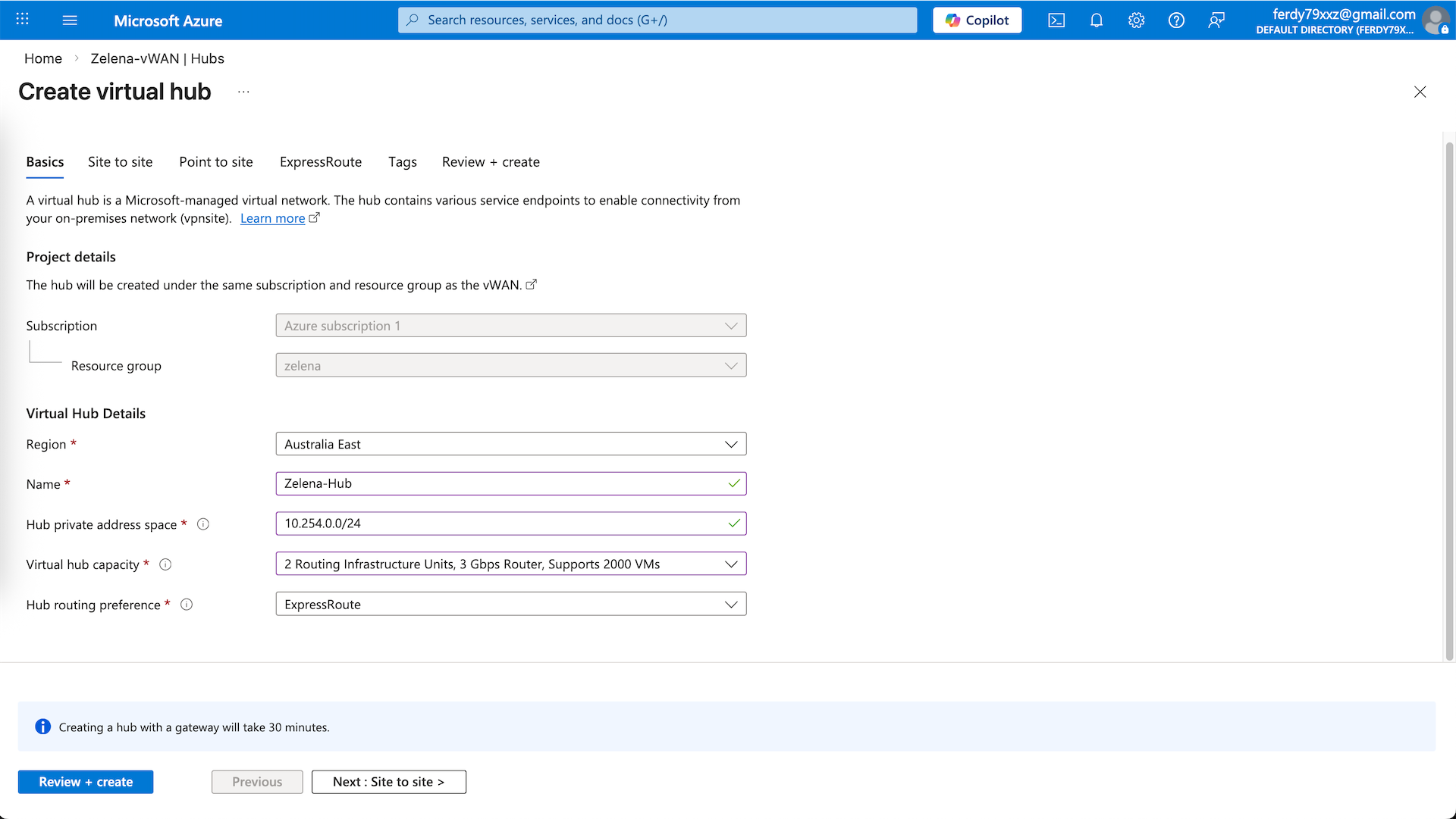 Give it name and provide it with a private subnet that’s not used, then select the lowest hub capacity and leave the rest as is