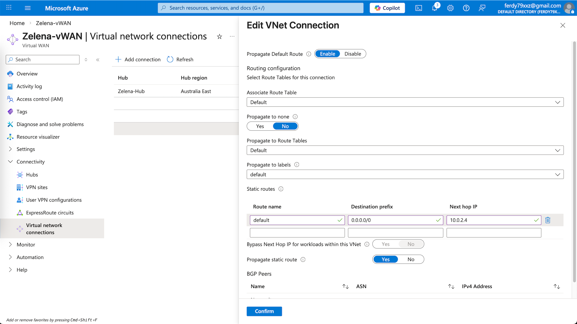 We will use the zelena-vnet as our egress network, for that we will add a static route to steer all traffic to Fortigate’s internal ip address. Ensure propagate static ip is checked so this route is propagated to the rest of the spokes