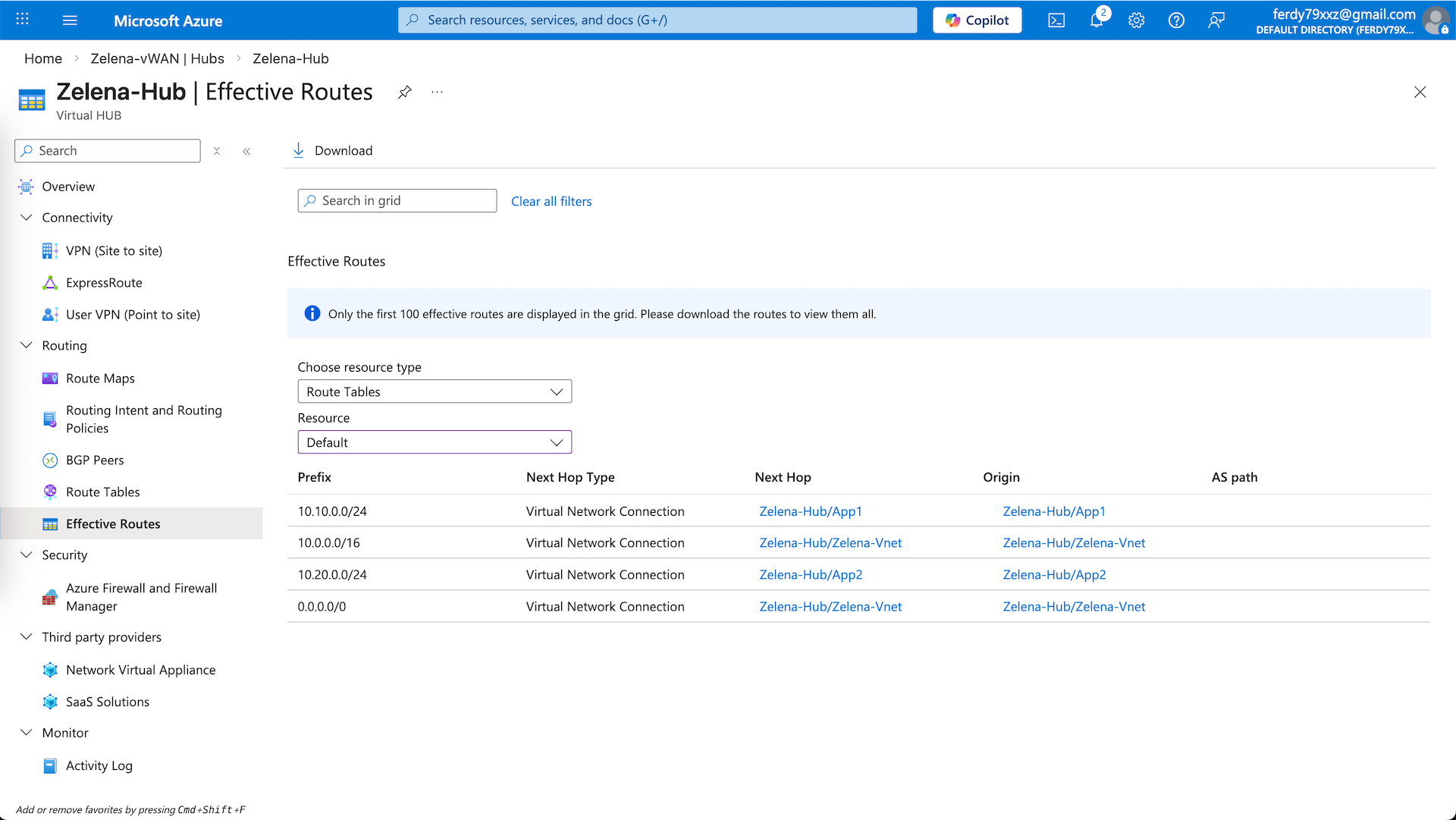 We can verify the routing for this hub on Effective Routes, ensuring 10.10.0.0/24 and 10.20.0.0/24 are going to their respective vnets, and 0.0.0.0/0 is going to the zelena-vnet