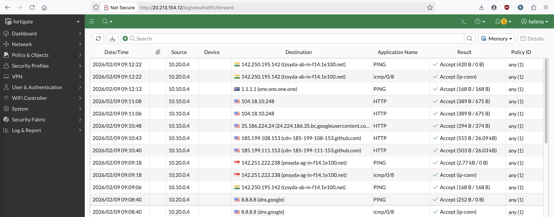 On the Fortigate side, we can see the traffic coming in from app1 and app2 going out to the internet
