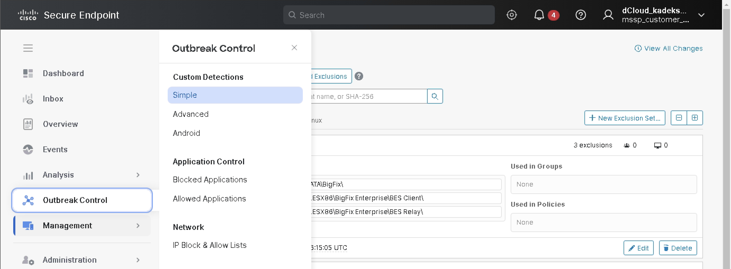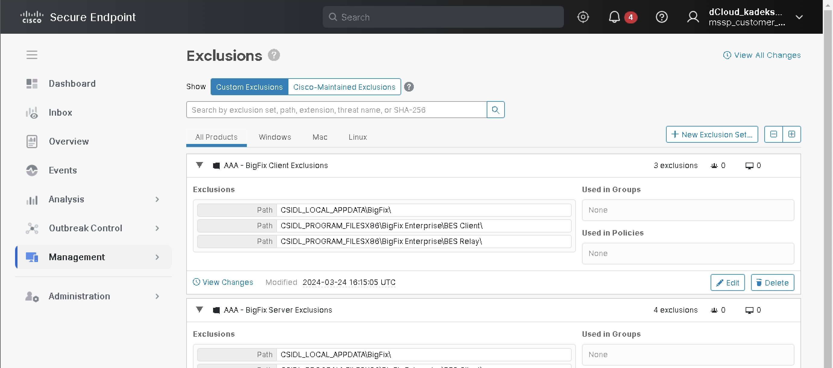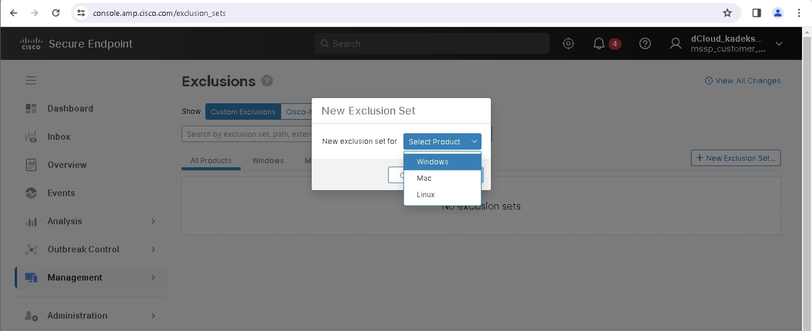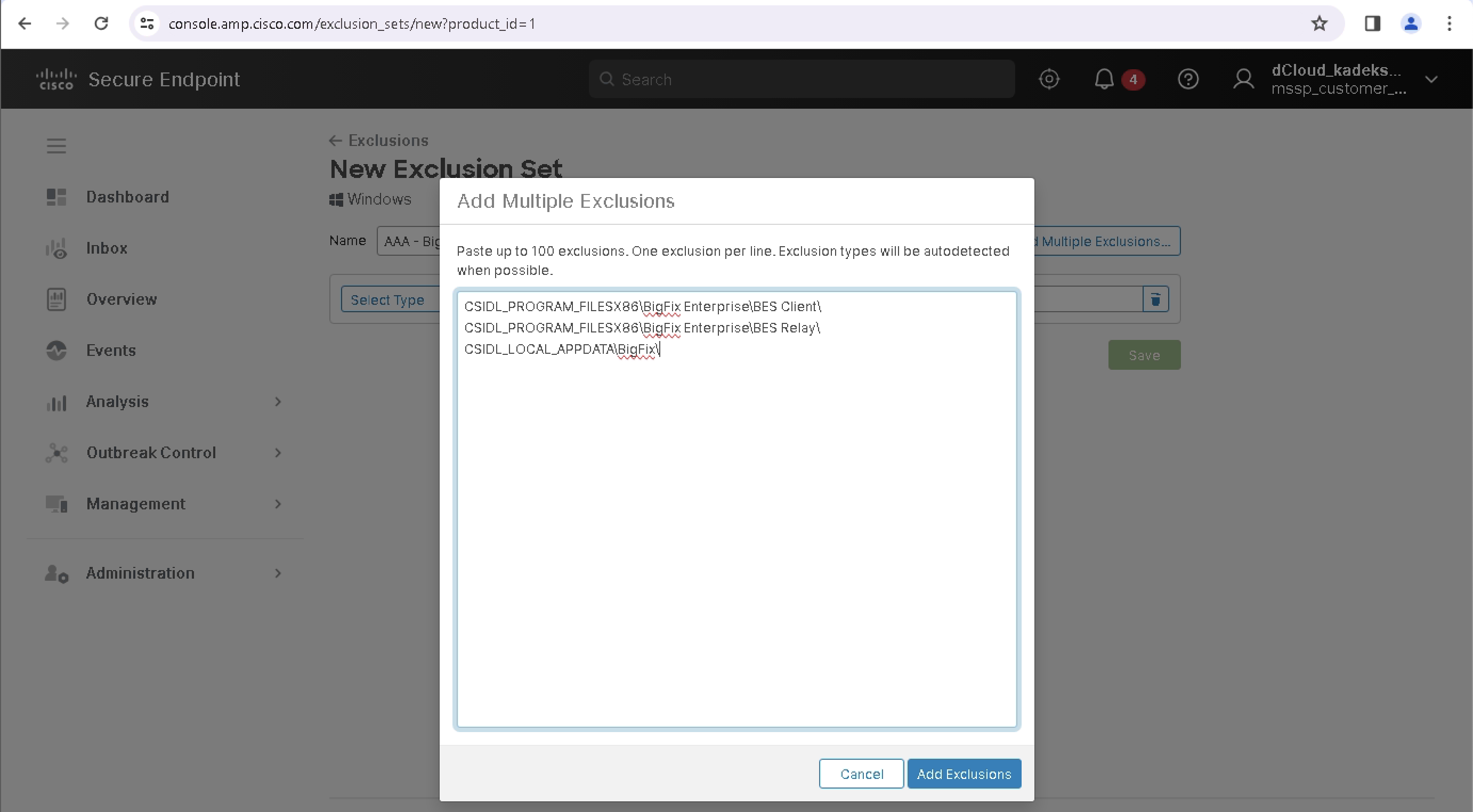 On here Select the Cisco-maintained exclusions as needed and on Custom Exclusions user the one created earlier