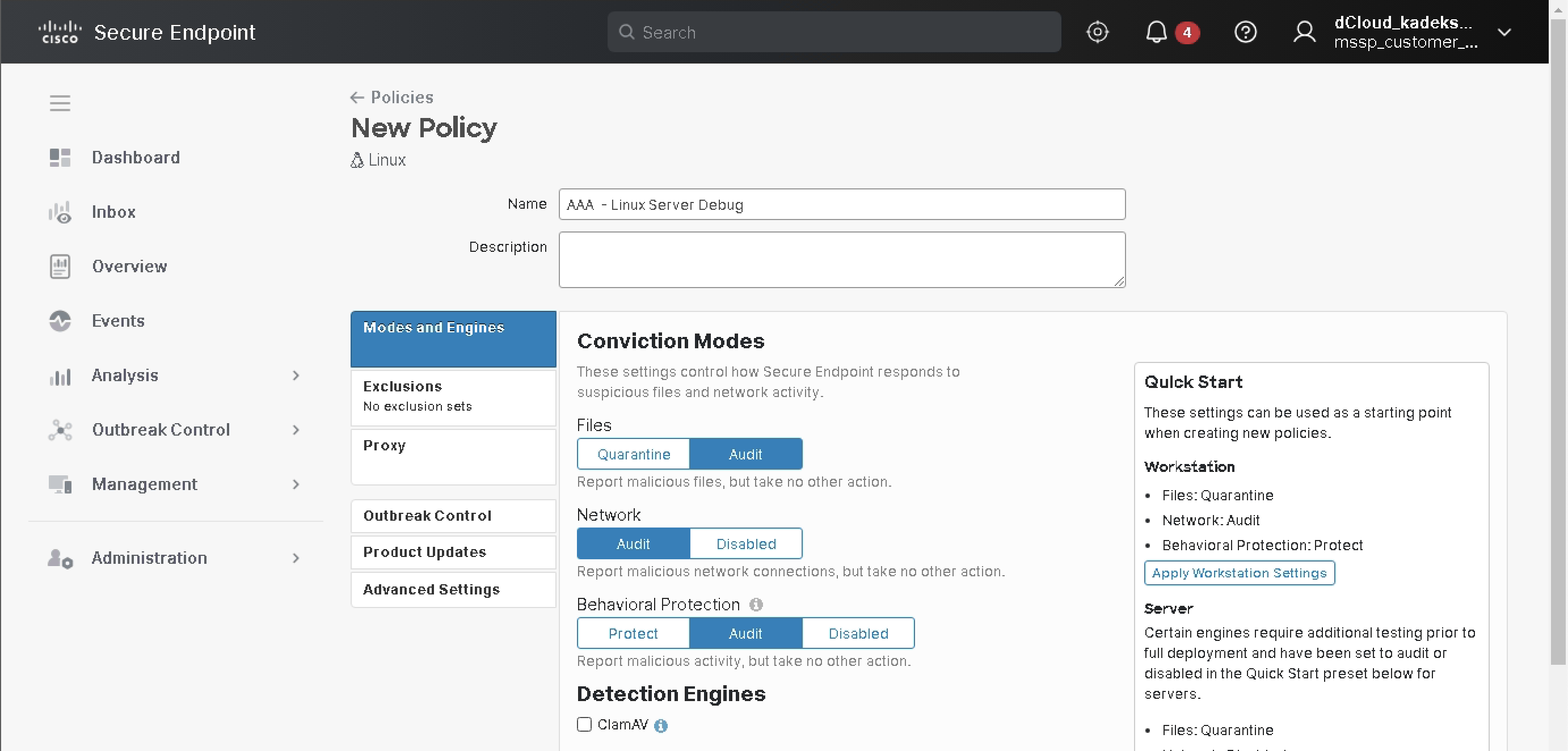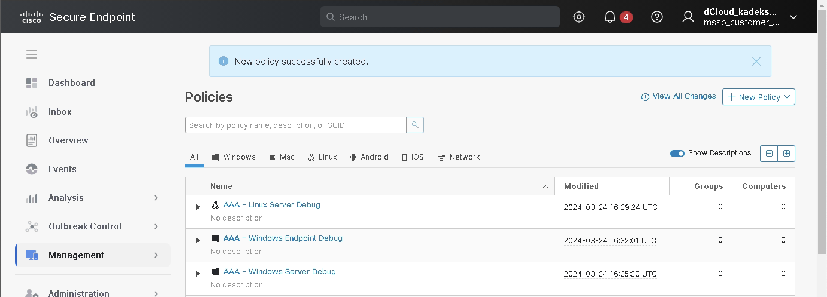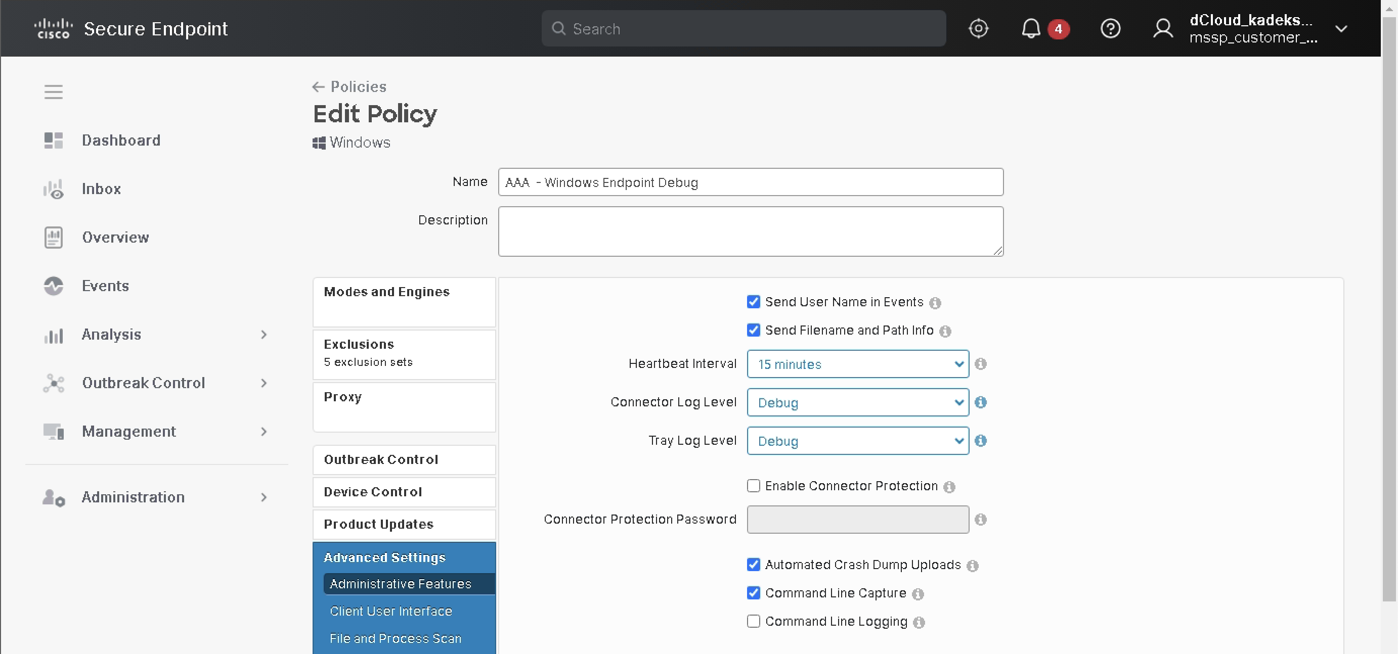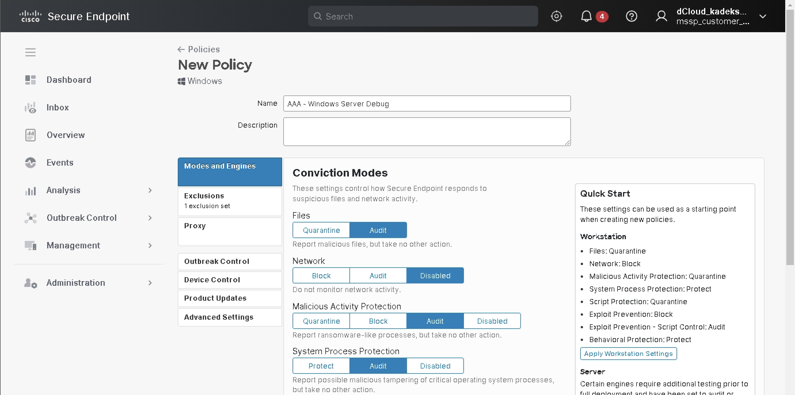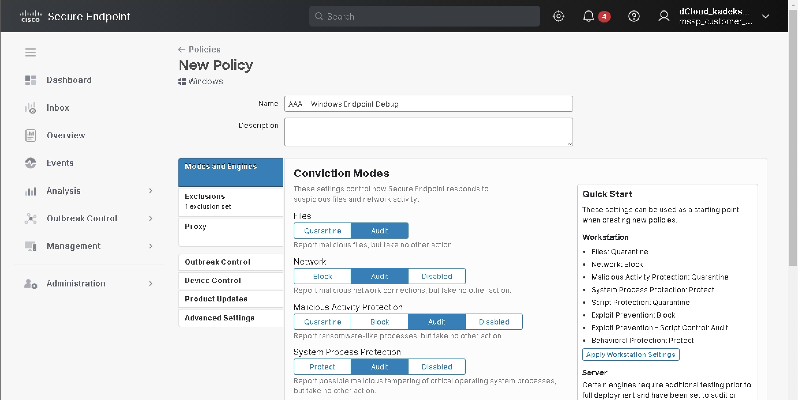 First we’ll create a new policy for Windows Endpoint with the mode set to Debug