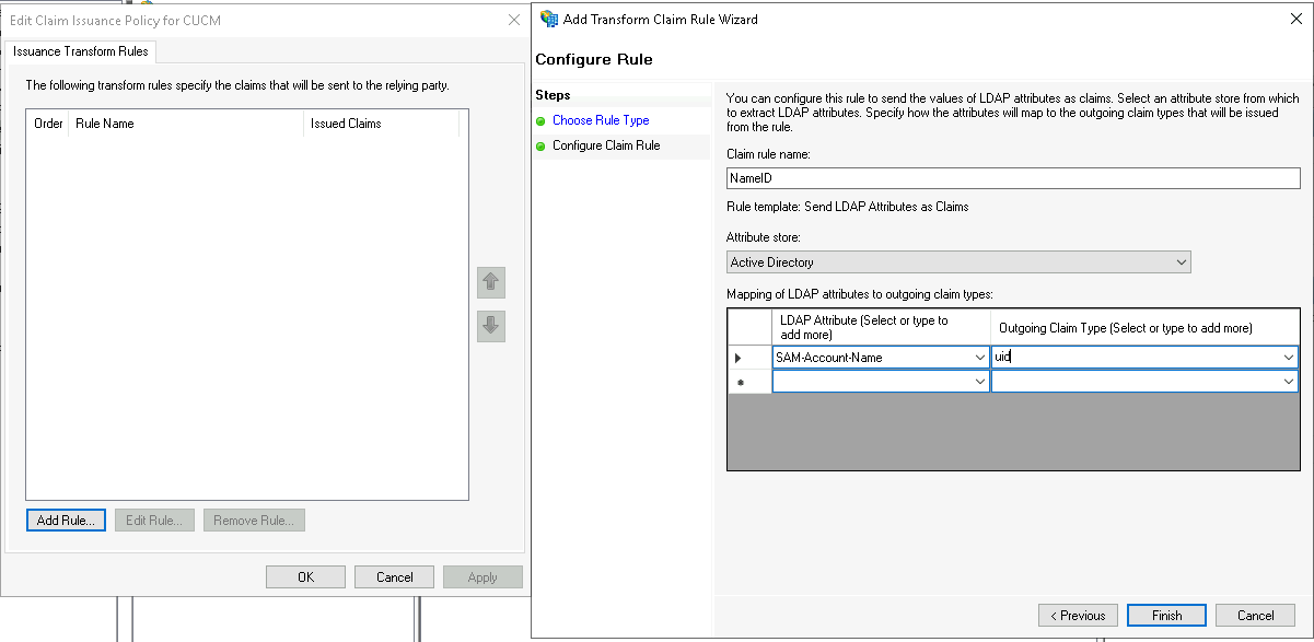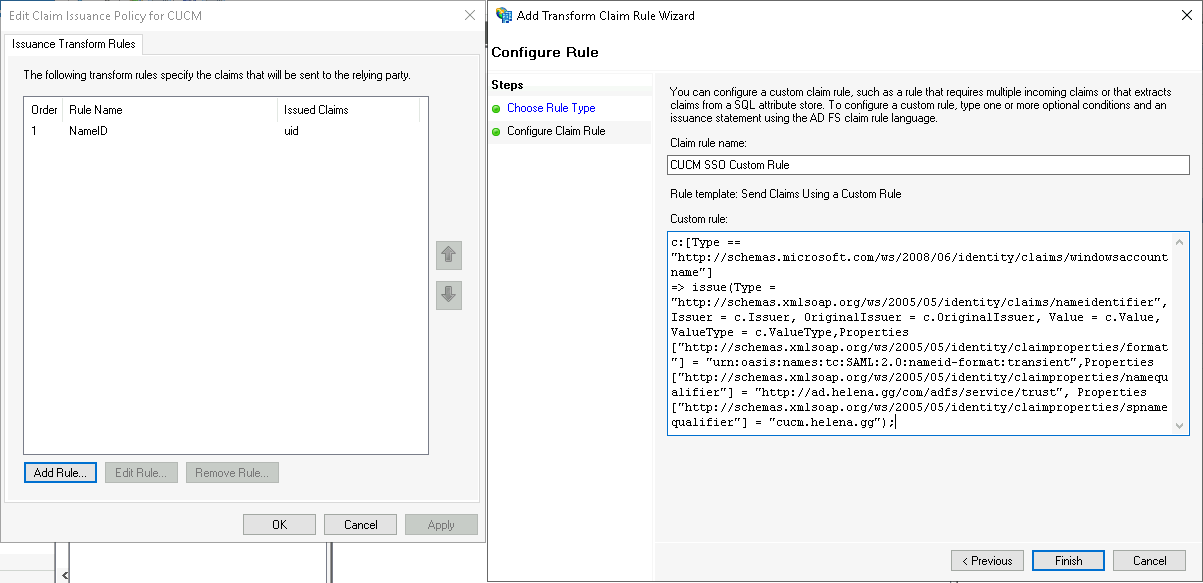 => issue(Type = "http://schemas.xmlsoap.org/ws/2005/05/identity/claims/nameidentifier", Issuer = c.Issuer, OriginalIssuer = c.OriginalIssuer, Value = c.Value, ValueType = c.ValueType,Properties["http://schemas.xmlsoap.org/ws/2005/05/identity/claimproperties/format"] = "urn:oasis:names:tc:SAML:2.0:nameid-format:transient",Properties["http://schemas.xmlsoap.org/ws/2005/05/identity/claimproperties/namequalifier"] = "http://ad.helena.gg/com/adfs/service/trust", Properties["http://schemas.xmlsoap.org/ws/2005/05/identity/claimproperties/spnamequalifier"] = "cucm.helena.gg");