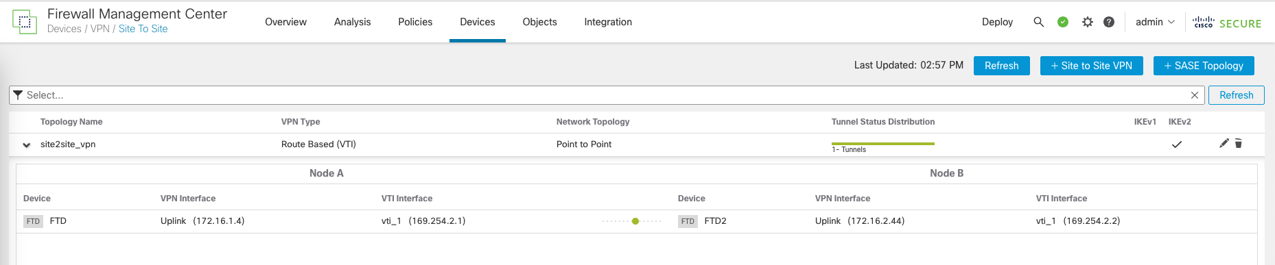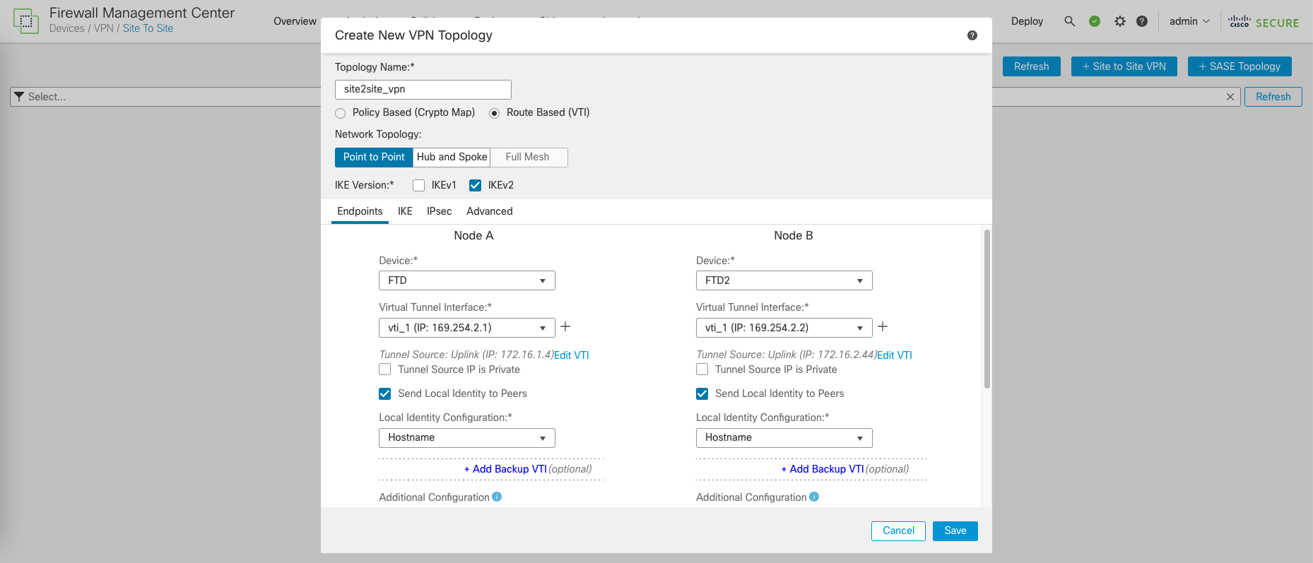 On FMC » Devices » Site to Site VPN, create New VPN Topology using Virtual Tunnel Interface (VTI)