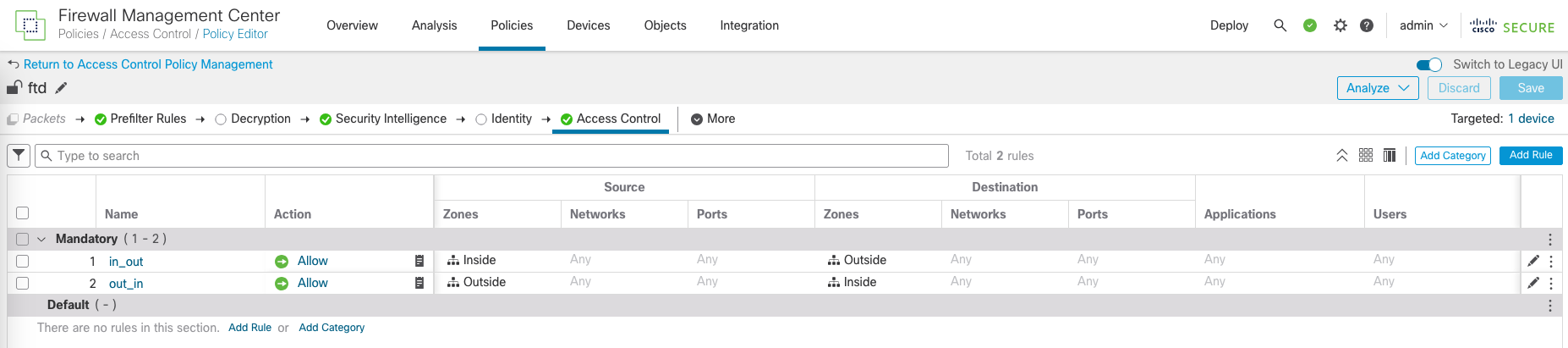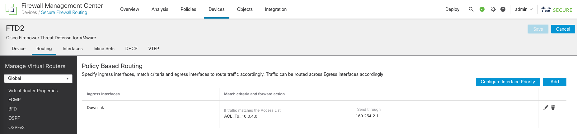 Now on Devices » Routing, we can add a PBR that matches the ACL to route the traffic to the VTI of the other node