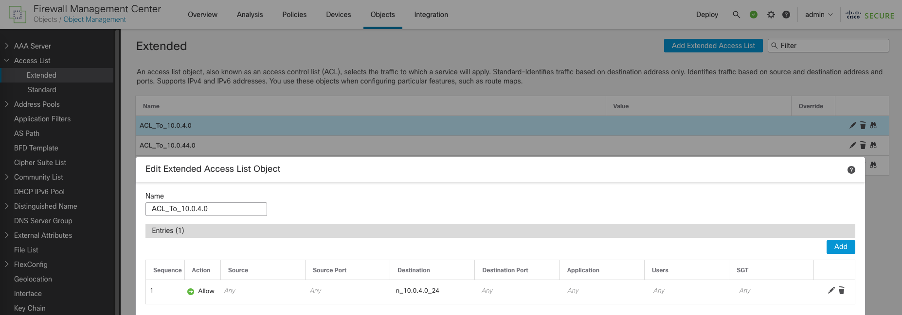 After that we’ll configure routes to forward traffic going to the subnets on the other node to the tunnel gateway, first lets create an Extended ACL for that on Object » Object Management » Access List