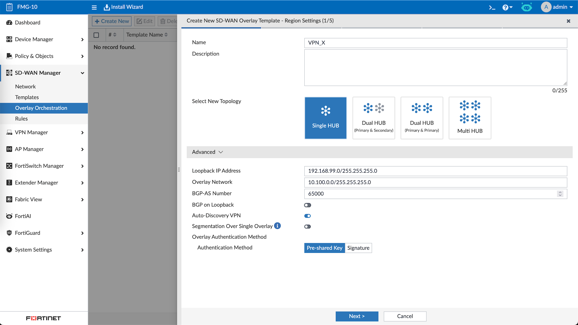 We select the 1 Hub type, enter the Loopback and Overlay networks