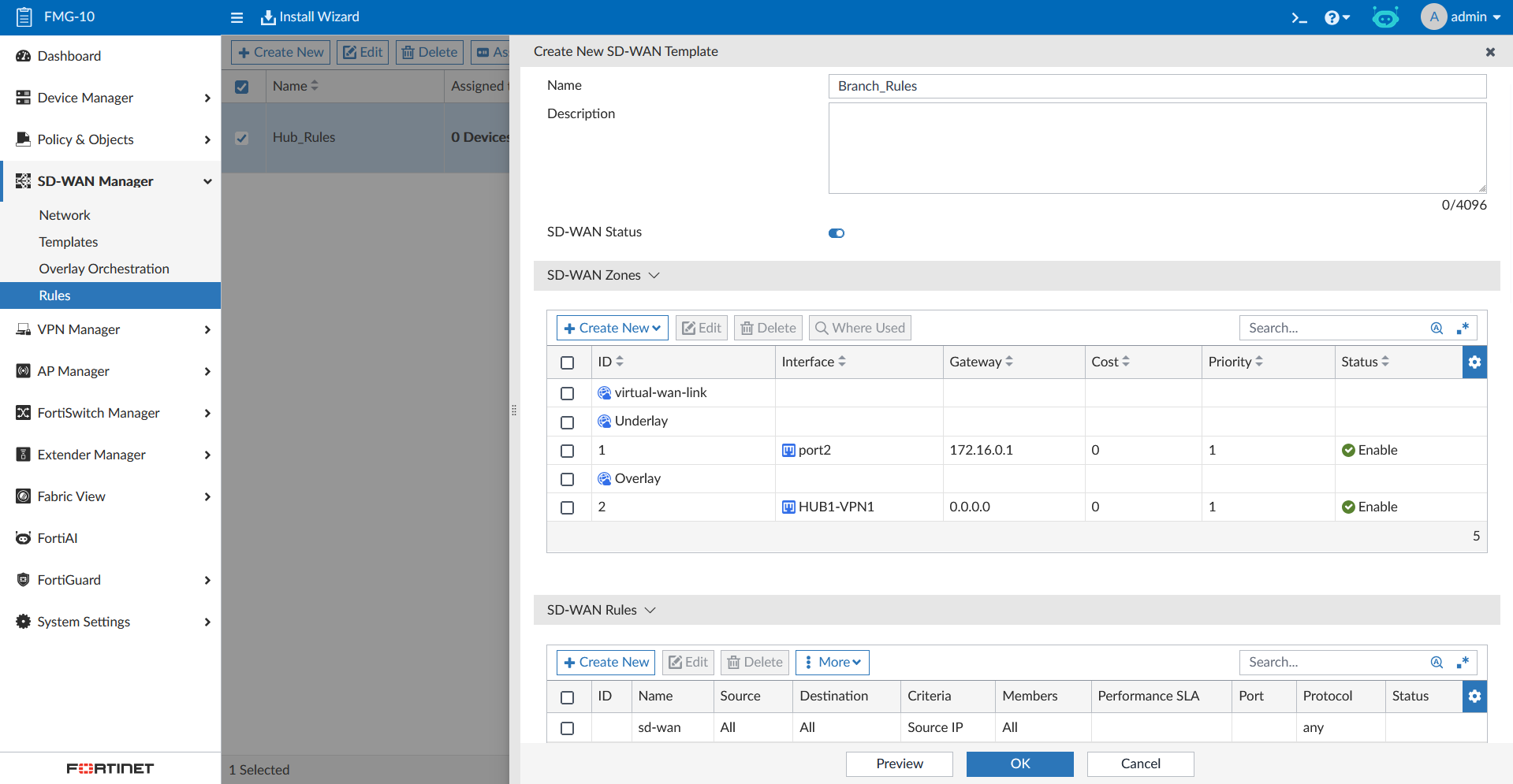 One this is still missing, which is the SD-WAN configuration. Here we will create a new SD-WAN Template for Hub and Spokes