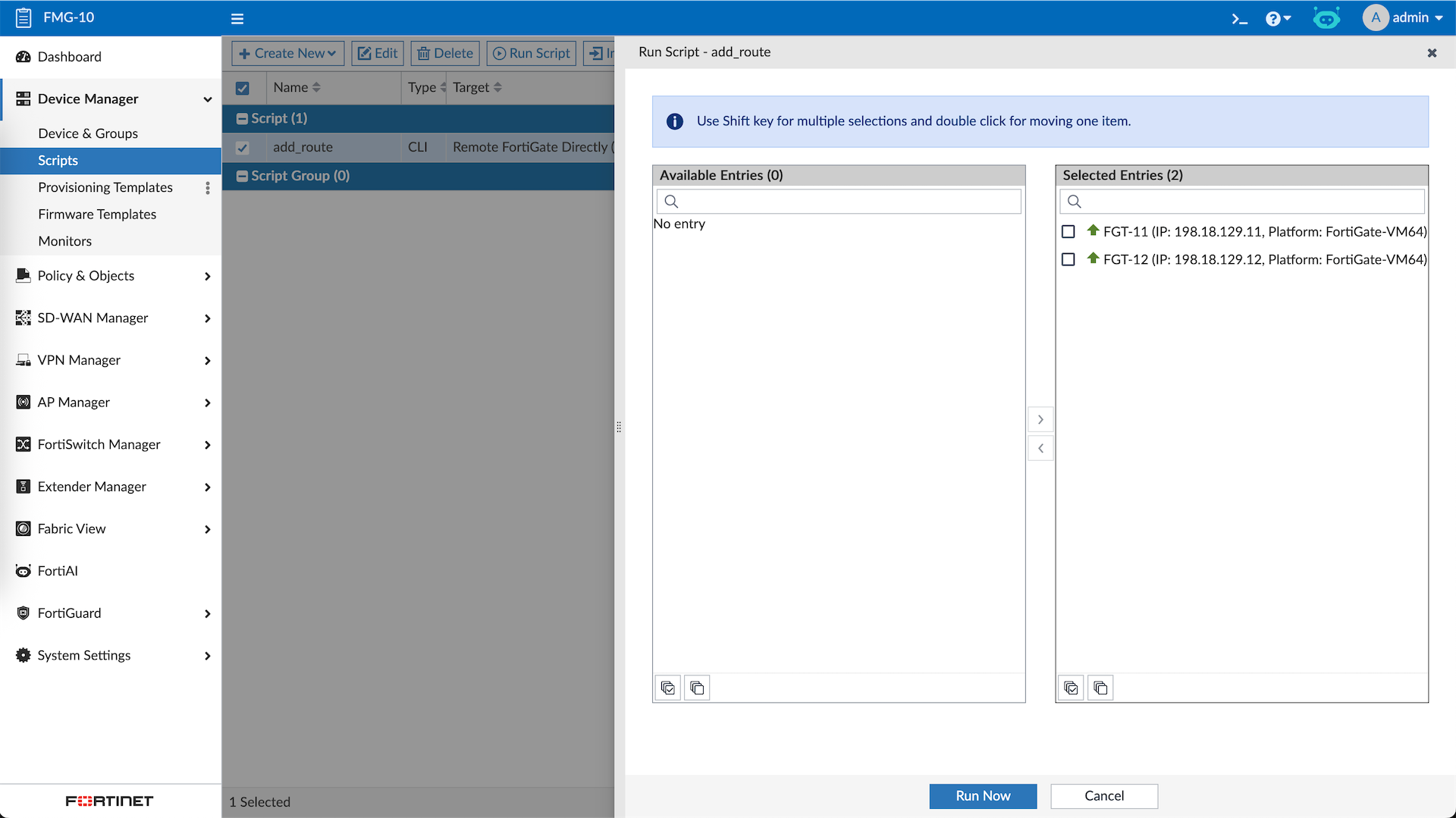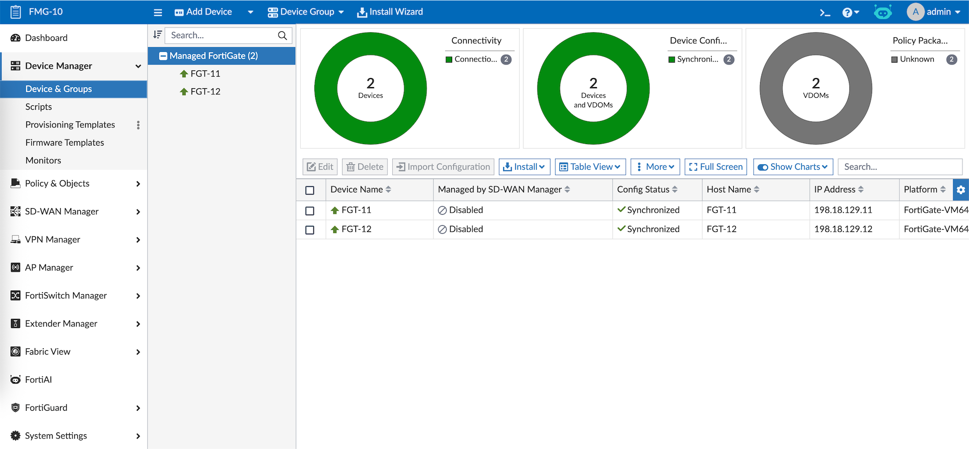 FMG allows us to manage multiple Fortinet devices in a single dashboard, here we have 2 FGTs that’s already been registered