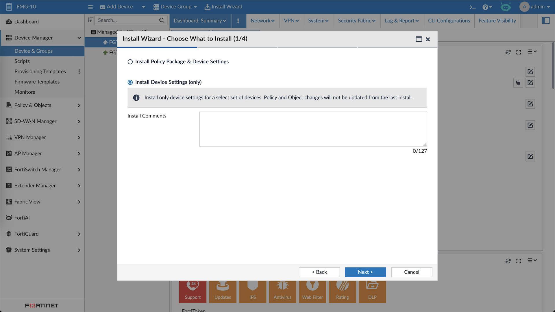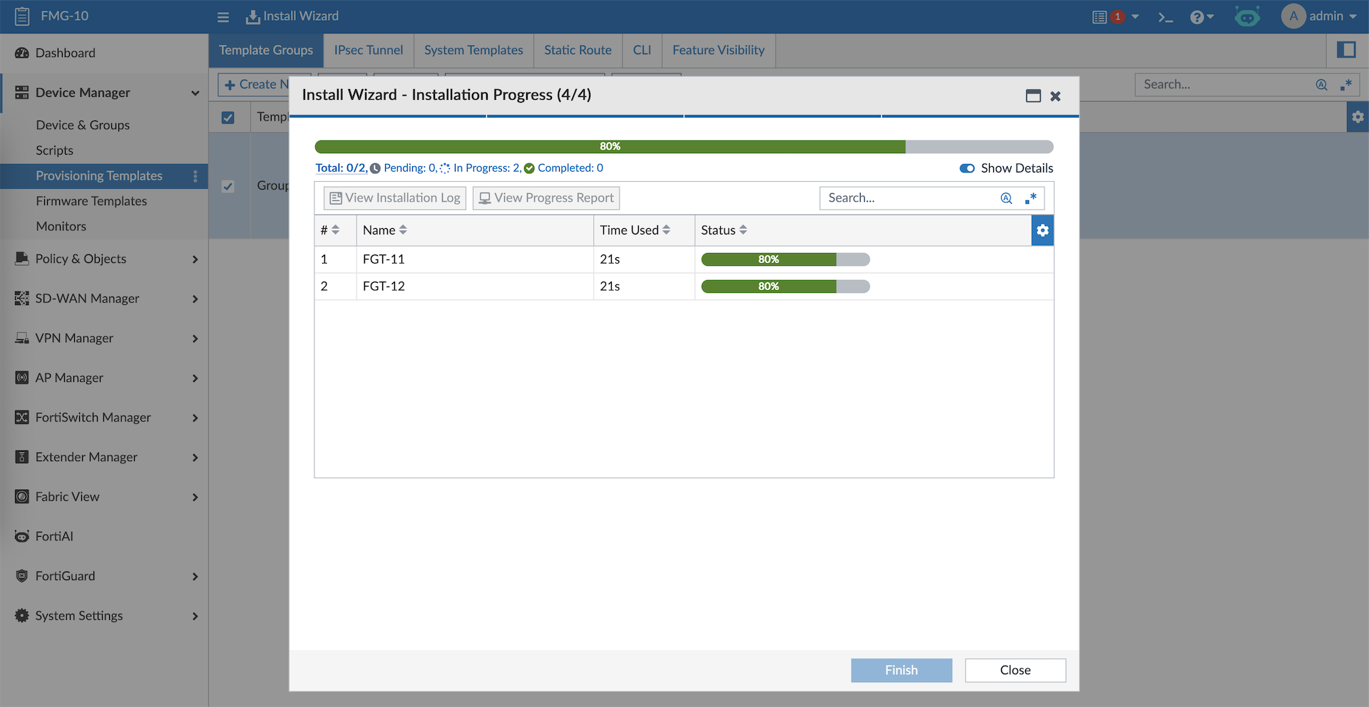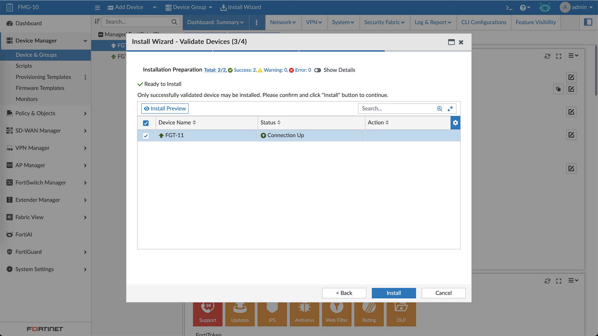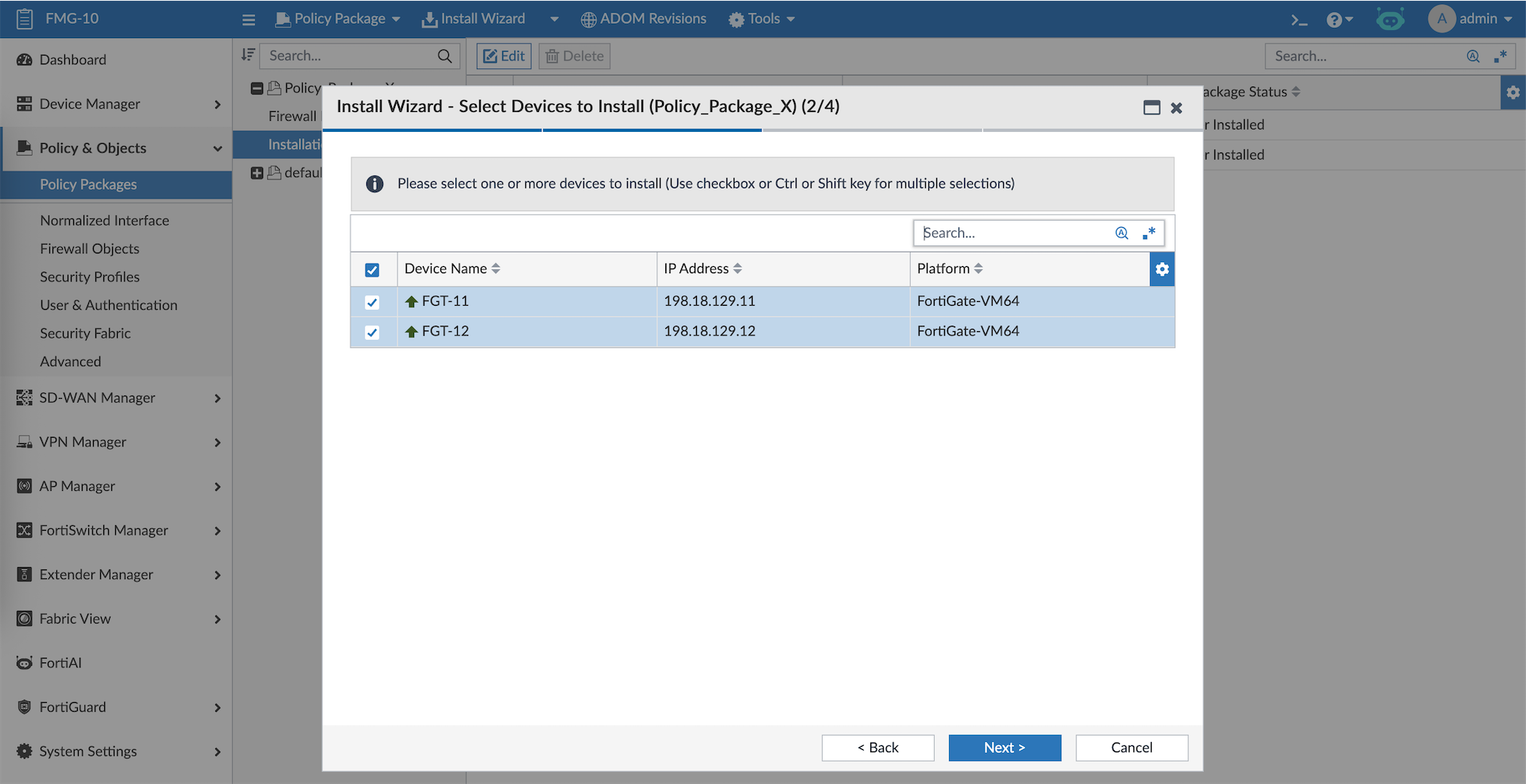 And the firewall policies along with the objects created on FMG are pushed to all target devices