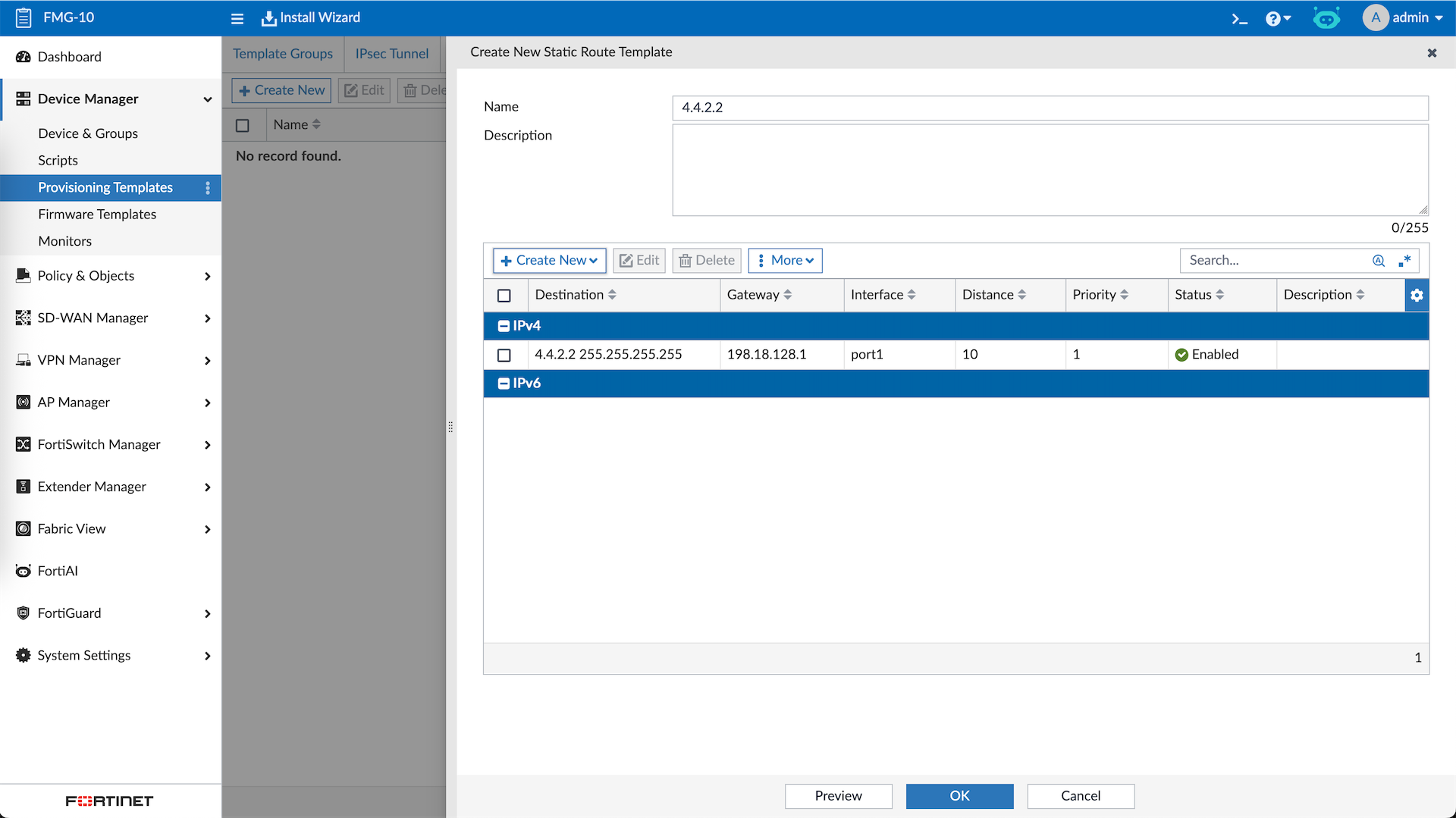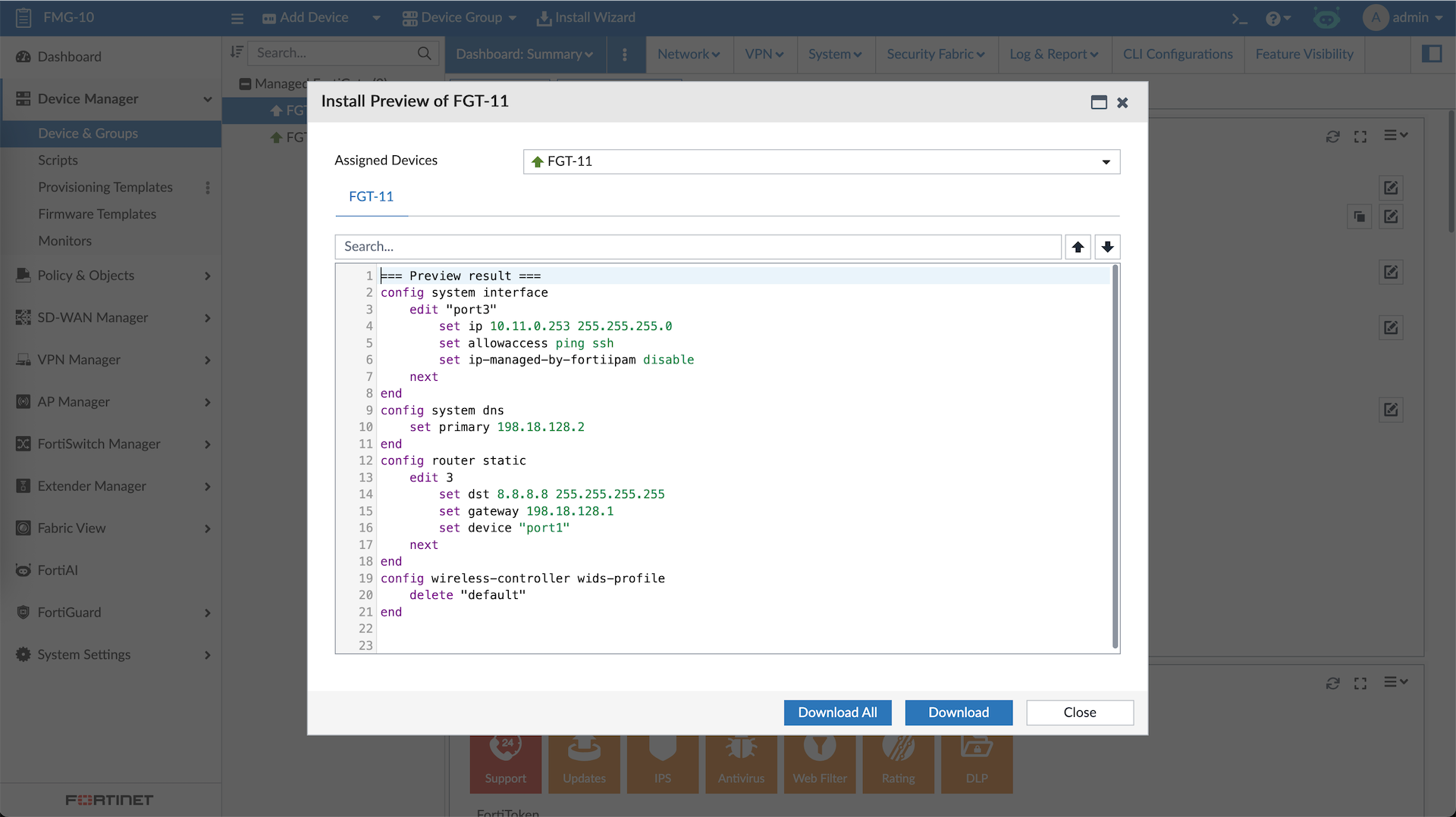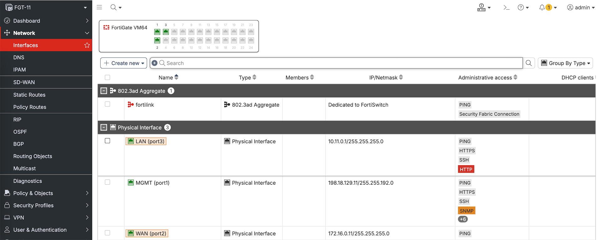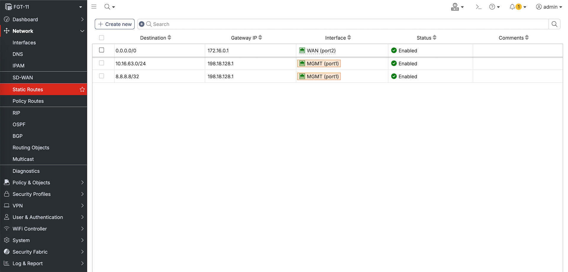 Managing these devices include making changes directly to them, here we will make some changes to FGT-11’s Interface and Static Route