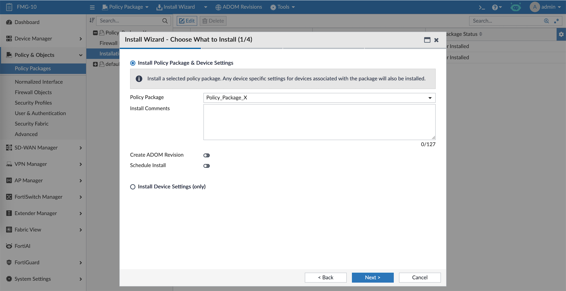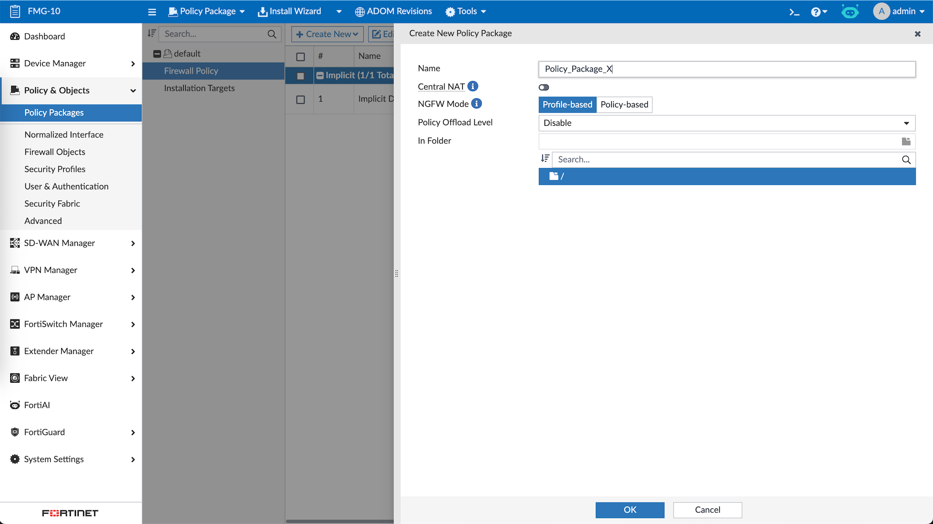 A policy package is a collection of firewall policies and related objects that are deployed together to one or more FortiGate devices. Here we will create new Policy Package