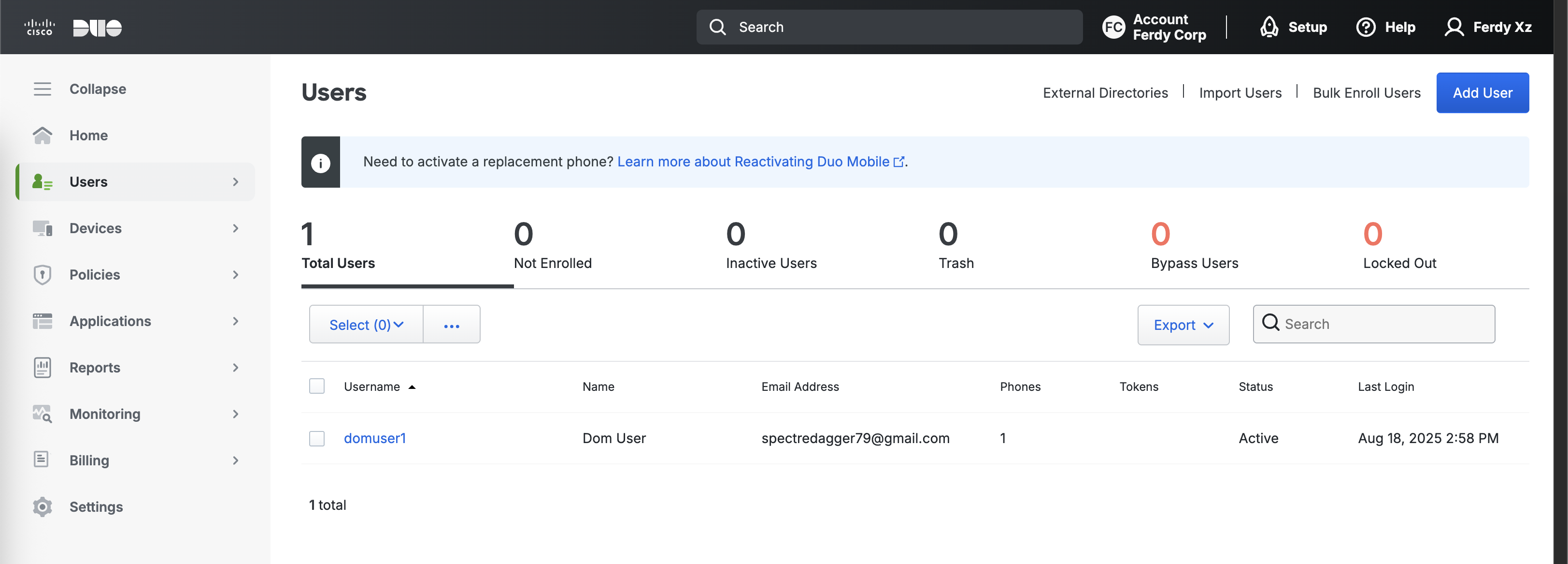 To enable Duo, we’ll pretty much follow a similar implementation as this one, first we make sure the user is present on Duo with same username as the one on AD