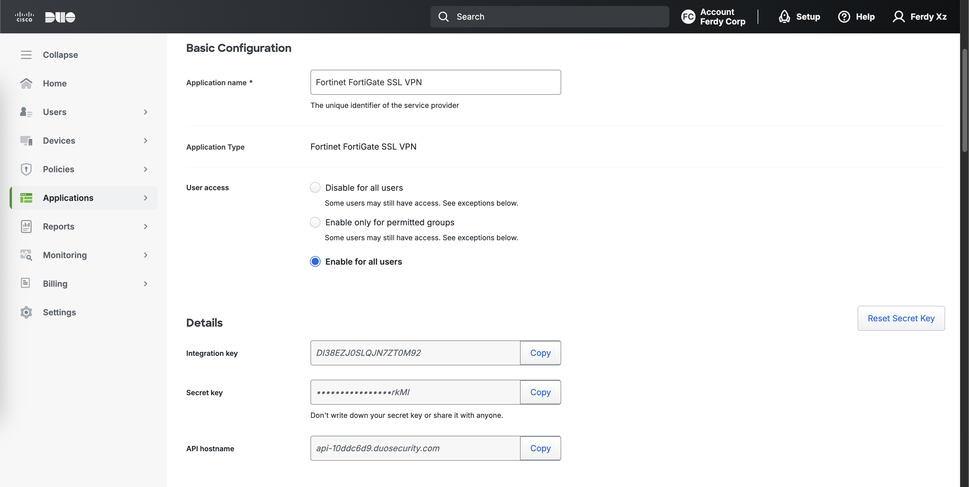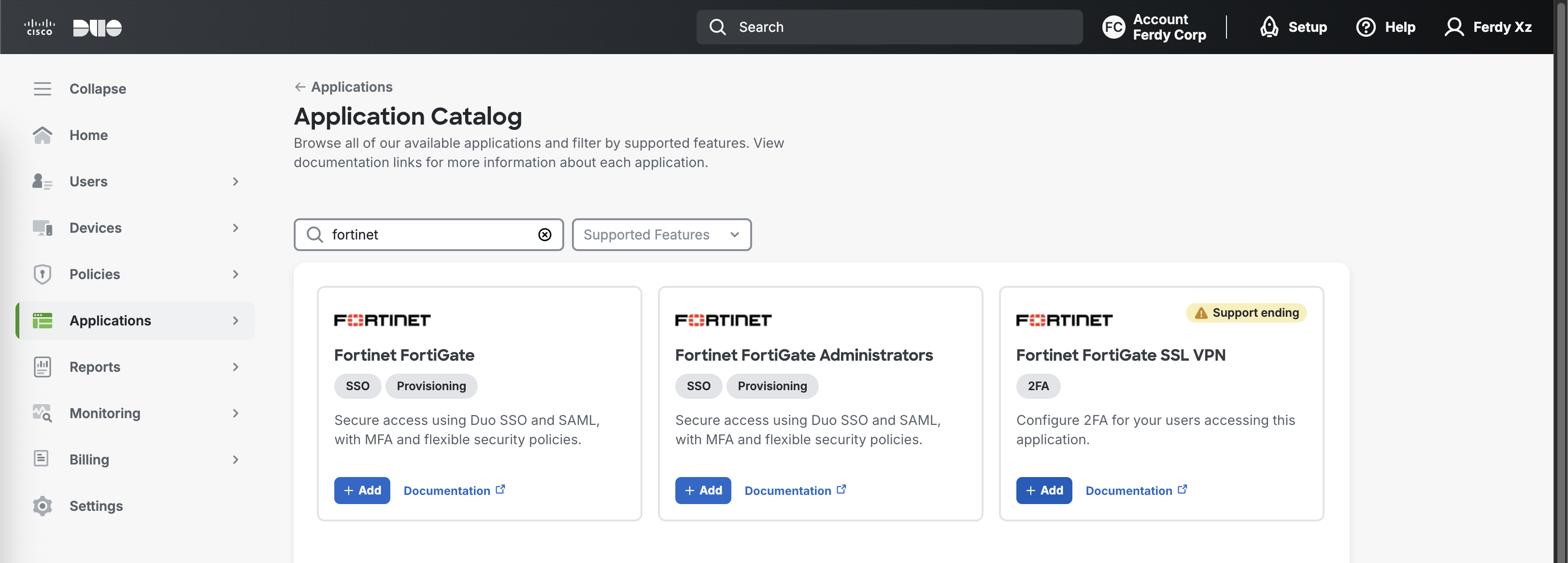 Then we add a Protected Application, Duo already provides a template for Fortigate SSL VPN so lets use that, even though actually we use IPSec but the authentication process is the same
