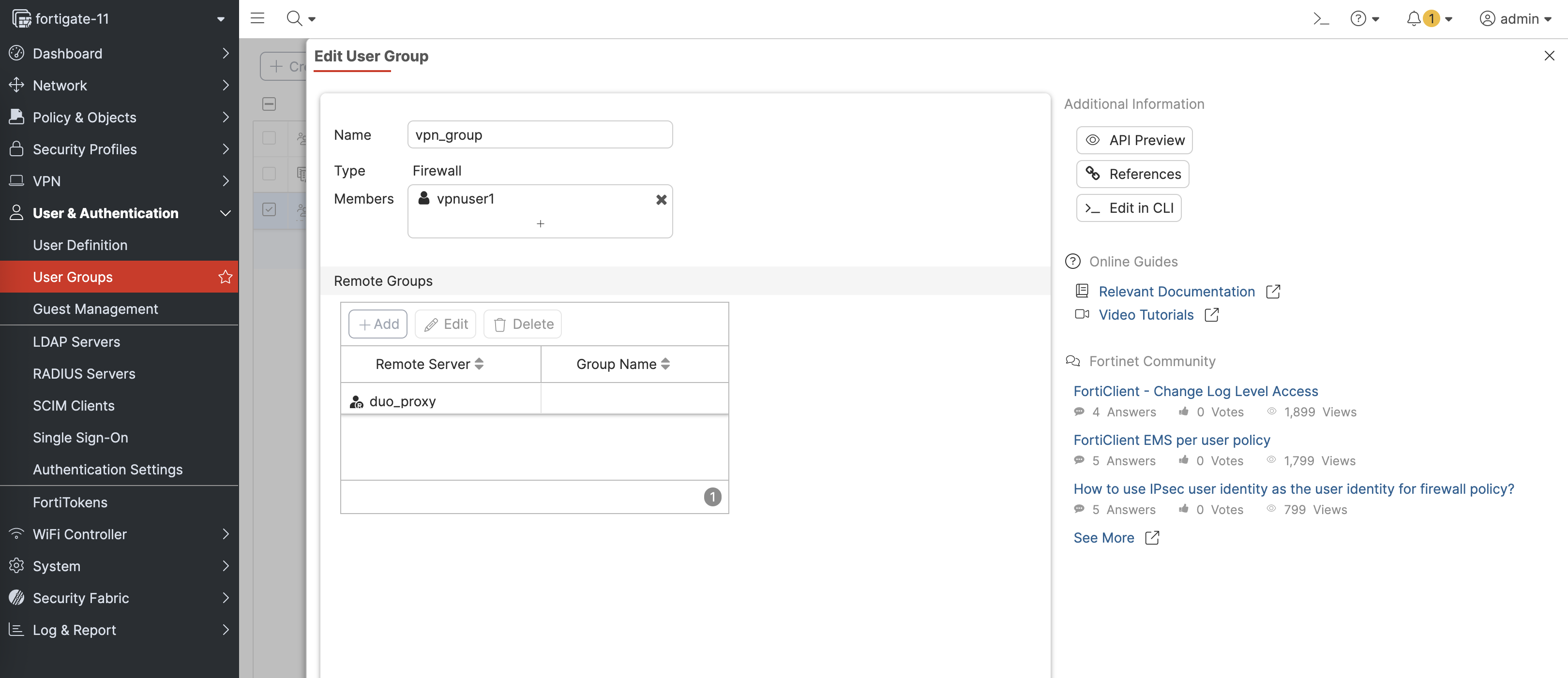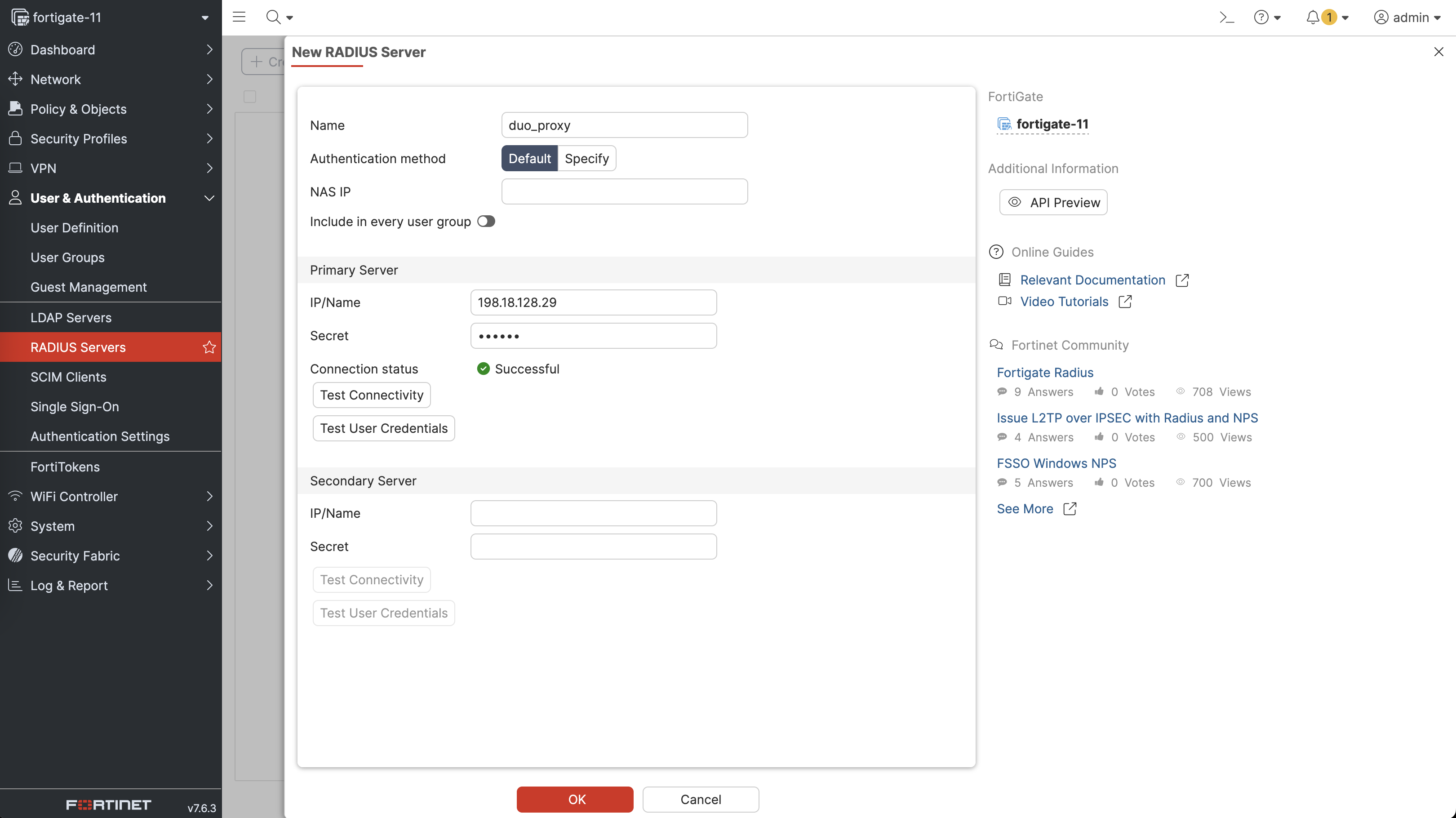 Next on the Fortigate, create a new Radius Server pointing to the Duo Proxy Server