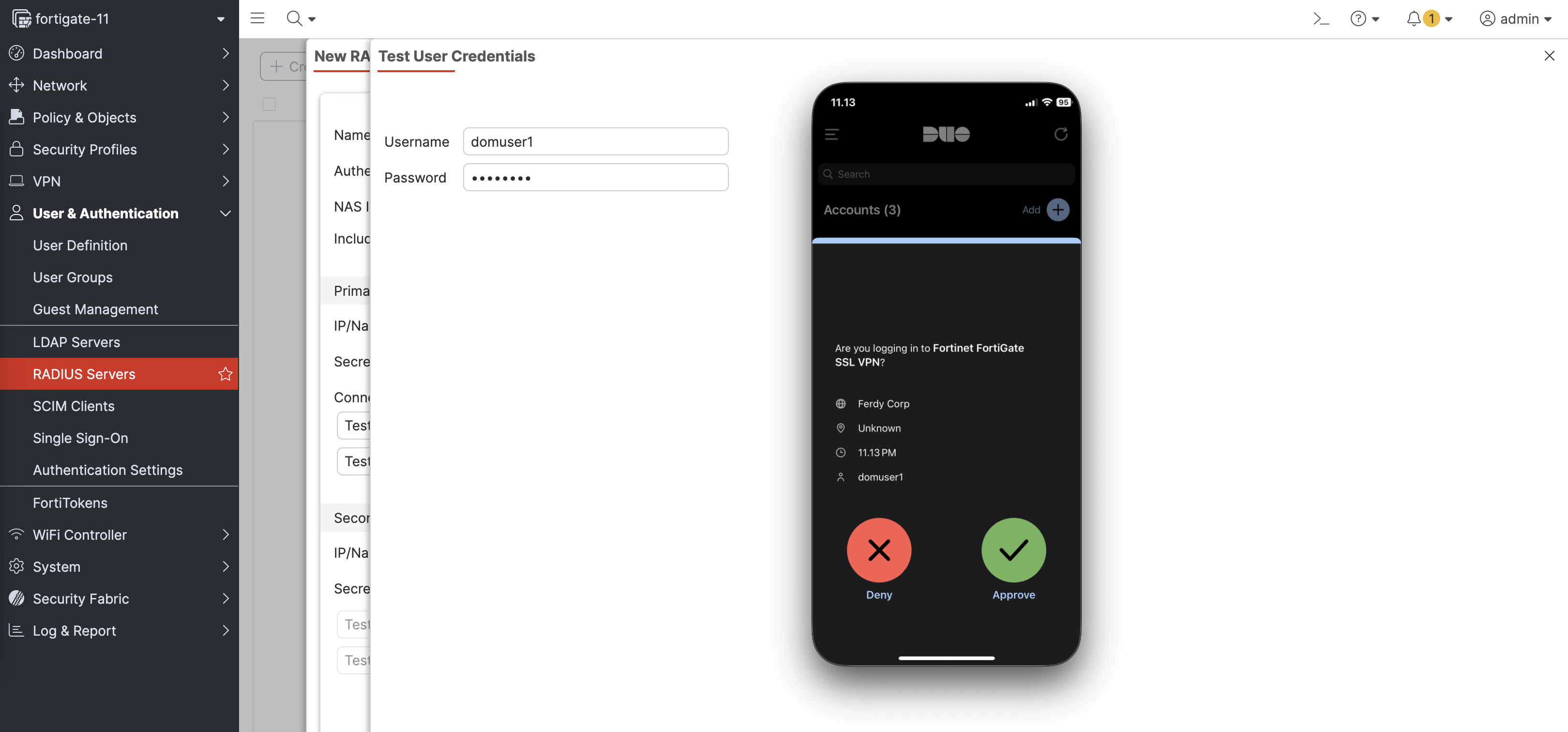 FortiGate Remote Access VPN with Cisco Duo MFA works by integrating Duo’s two-factor authentication into the VPN login flow. When a user connects through SSL-VPN or IPsec VPN on the FortiGate, they first authenticate with their primary credentials, then Duo pushes a second-factor challenge before granting access. This ensures only verified users can establish a secure VPN session.