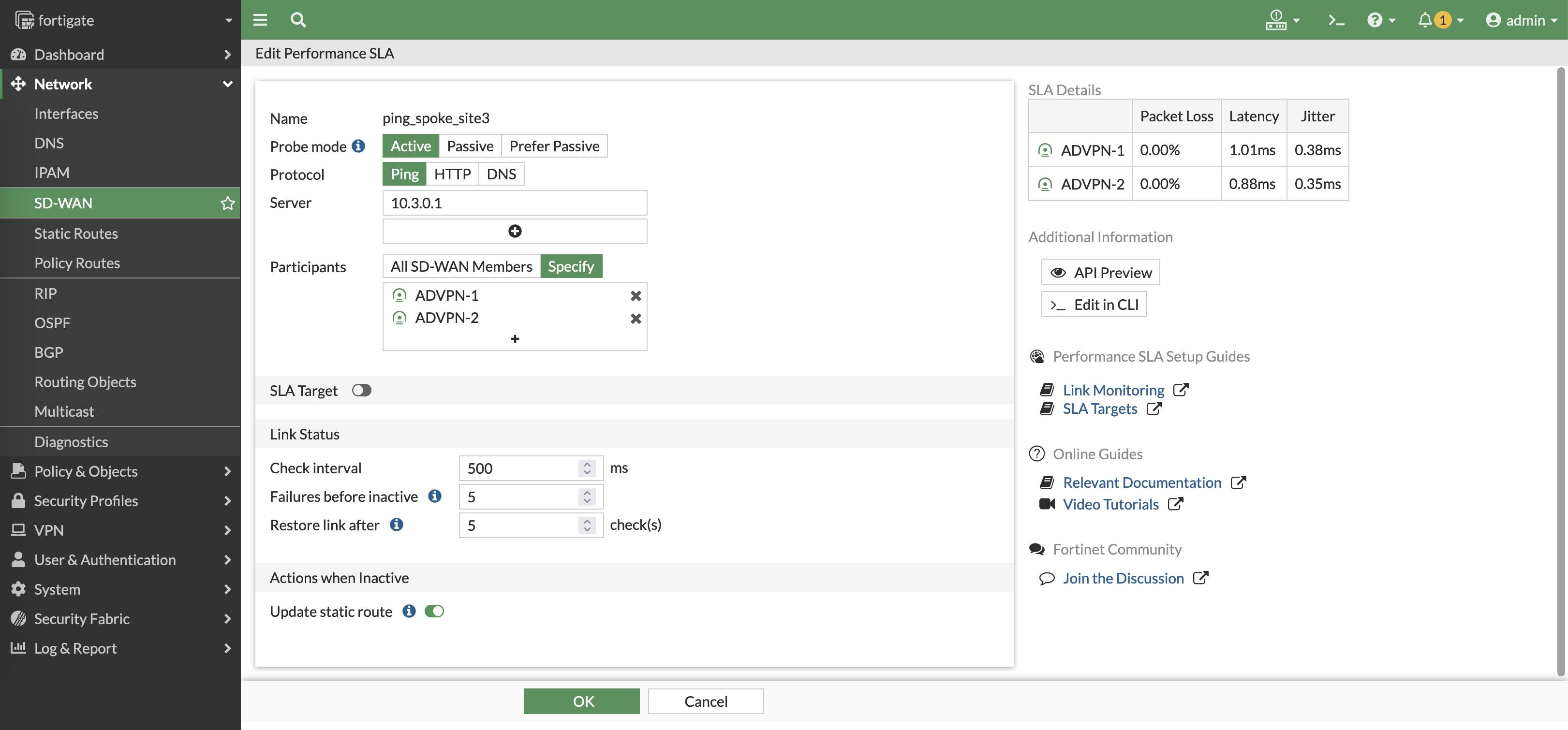 And on the Performanc SLA, we can see VPN 1 network is detected to be down
