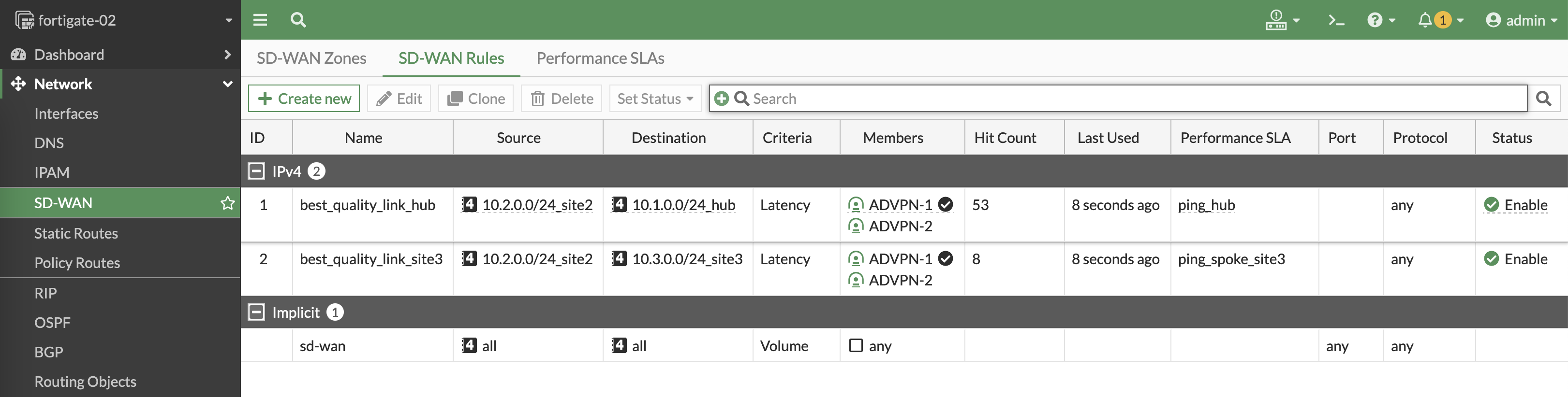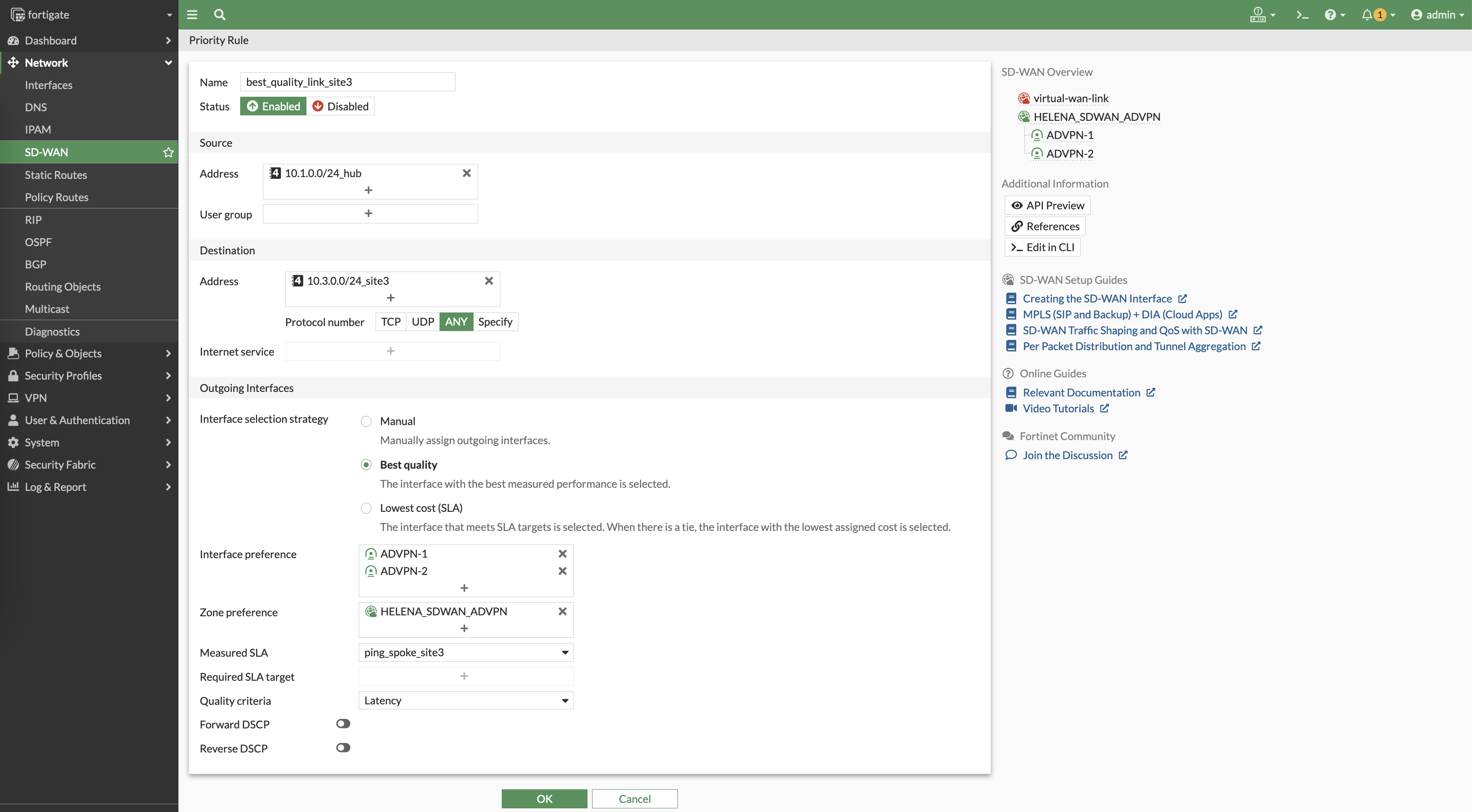 Next we create a new priority rule to utilize the performance SLA made to make judgement to use the lowest latency for the SD-WAN traffic to site 2