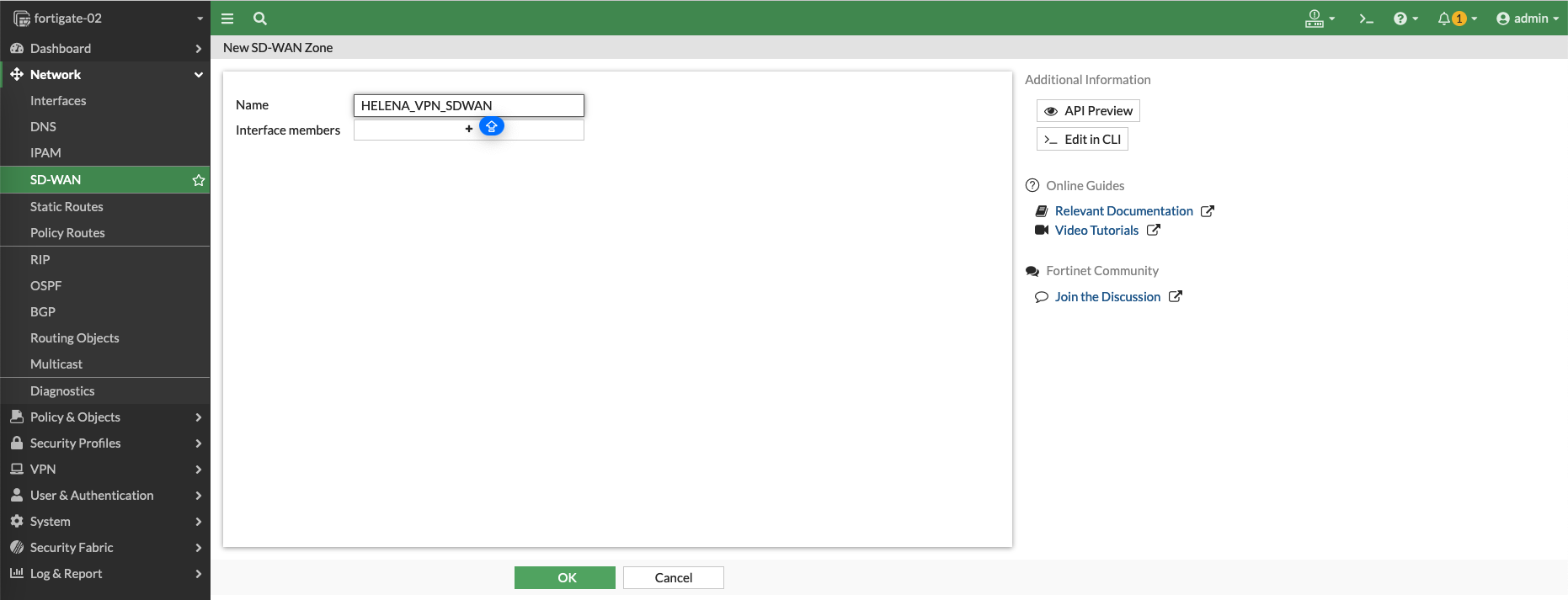 Then create a member of VPN 1 interface in the SD-WAN Zone