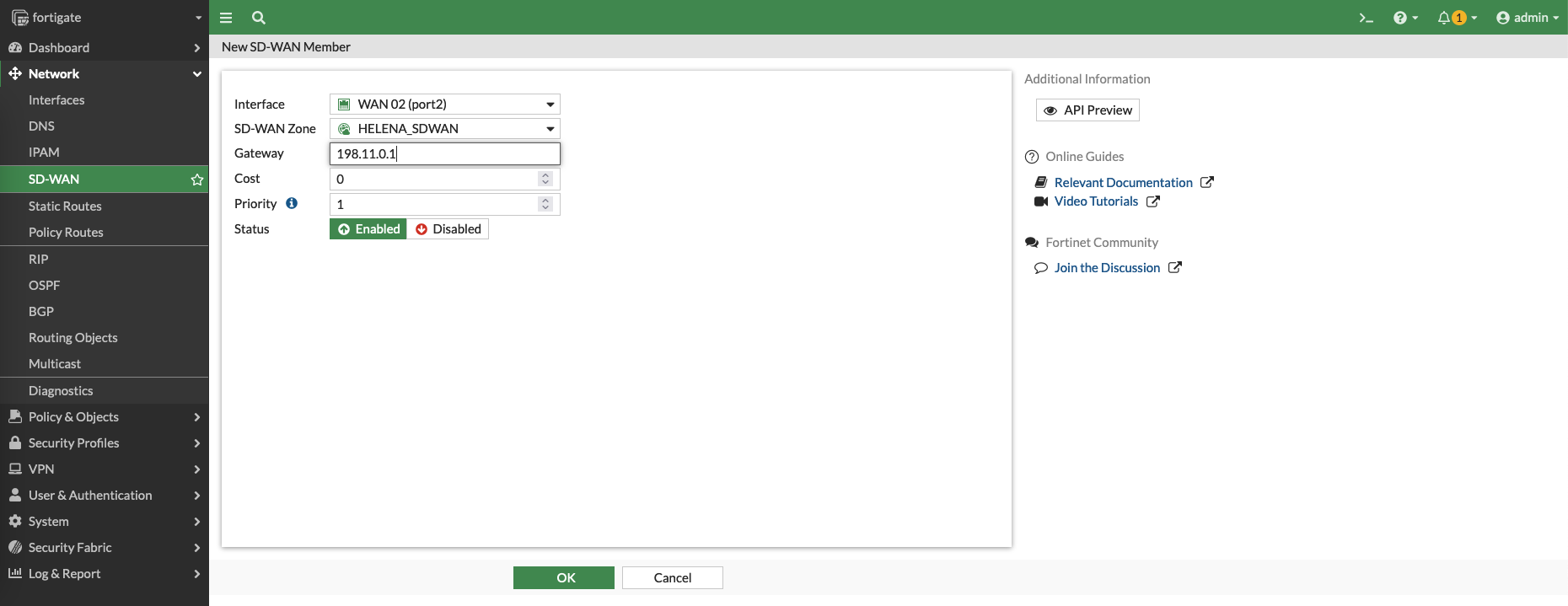 After that craete an SD-WAN Member containing the WAN1 interface and attach it to the Zone