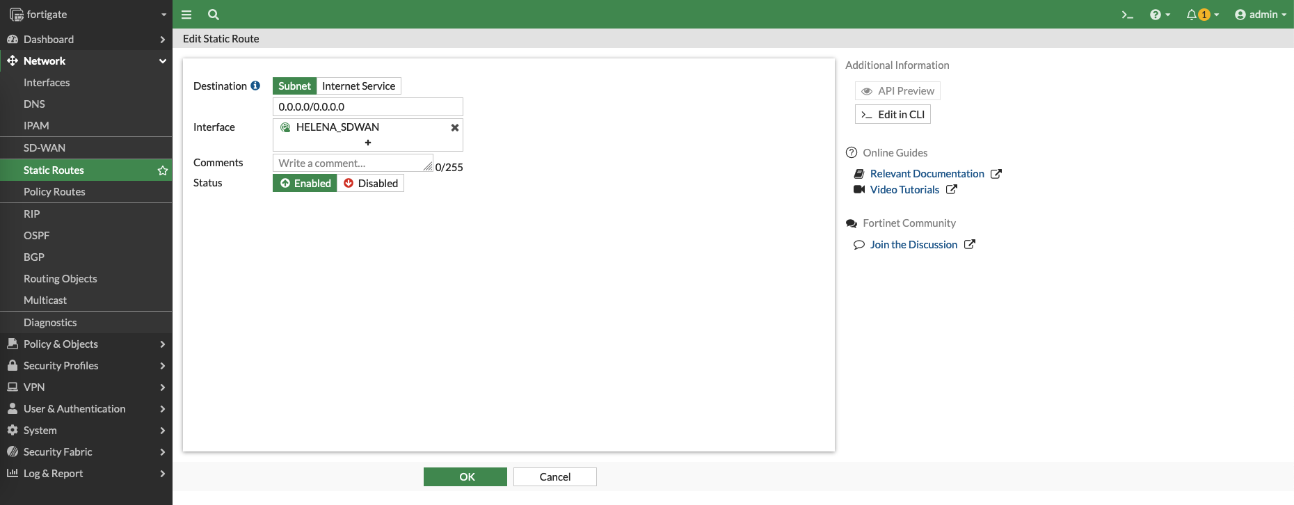 Next create a Static Route going out to the SD-WAN Interface