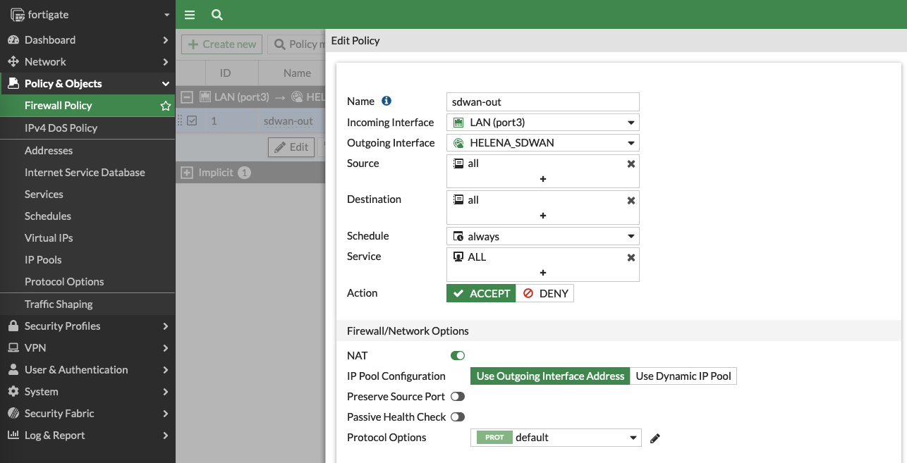 And lastly, create a Firewall Policy to allow Local Subnet to reach the Internet through the SD-WAN Interface