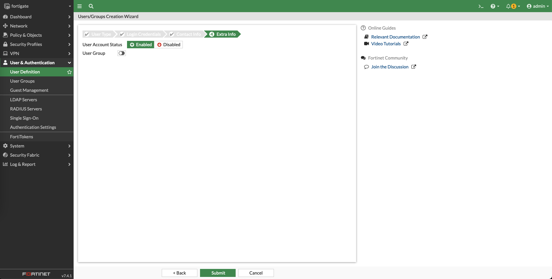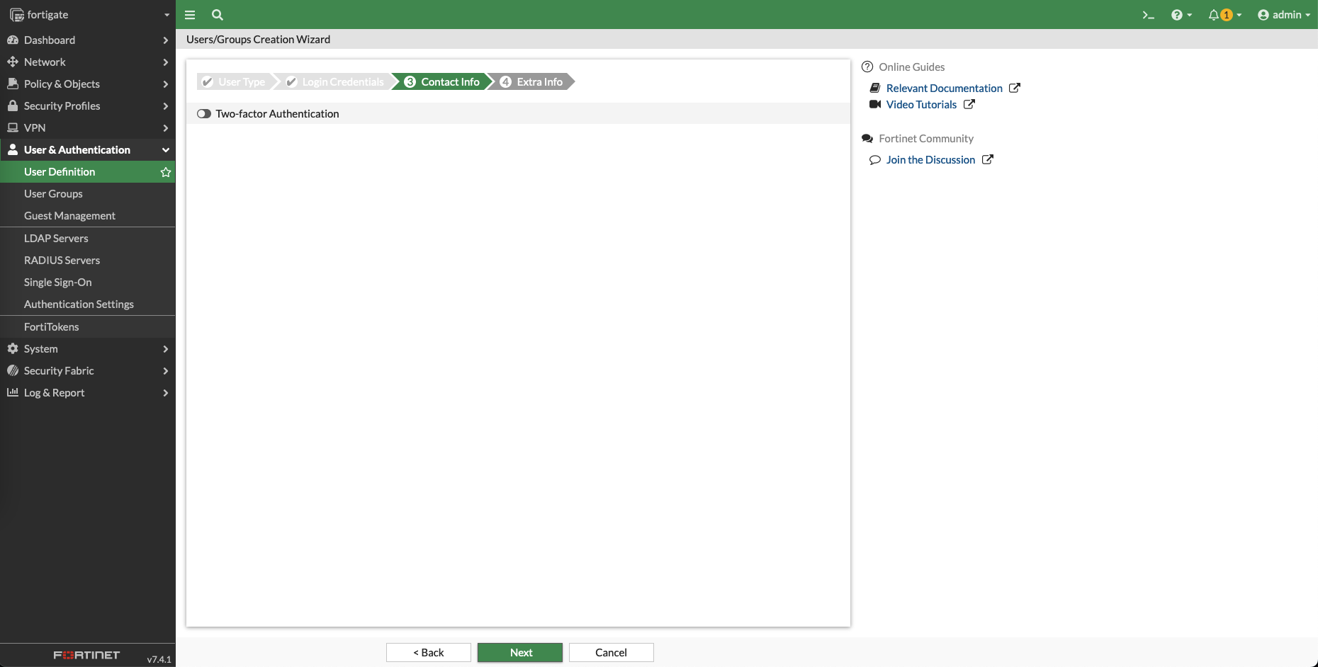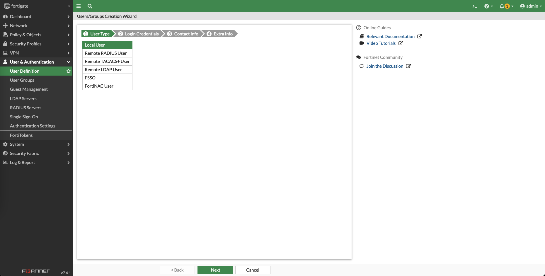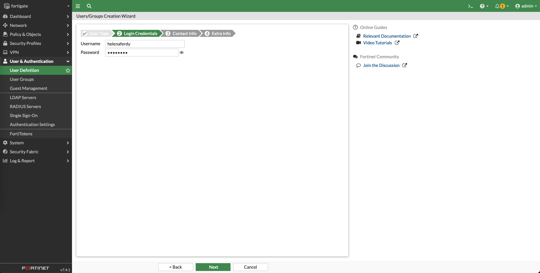 On Fortigate, go to User & Authentication » User Definition, create new, choose local user