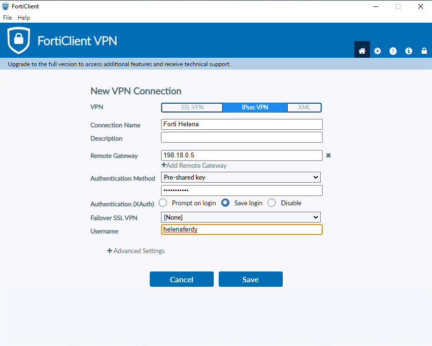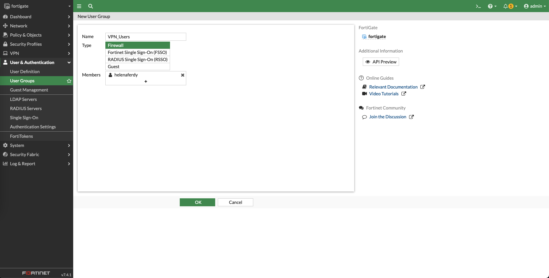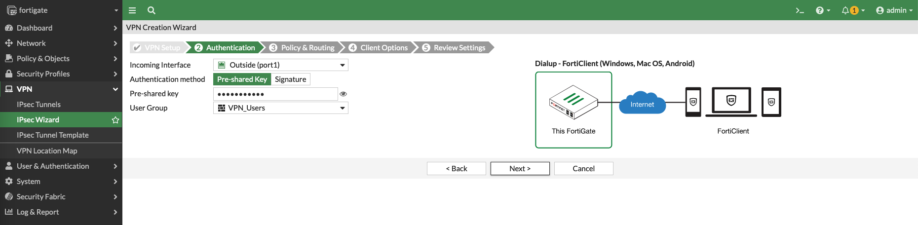 On Authentication, select the WAN interface as the incoming interface, the auth method as pre-shared key, and add the user group created earlier