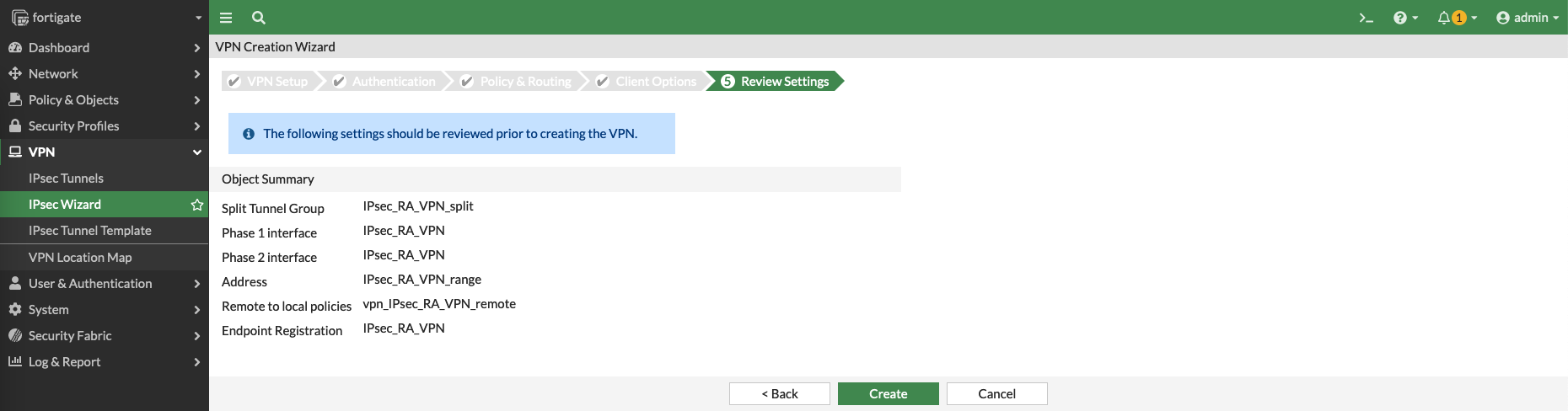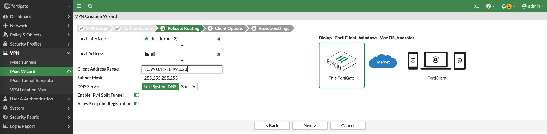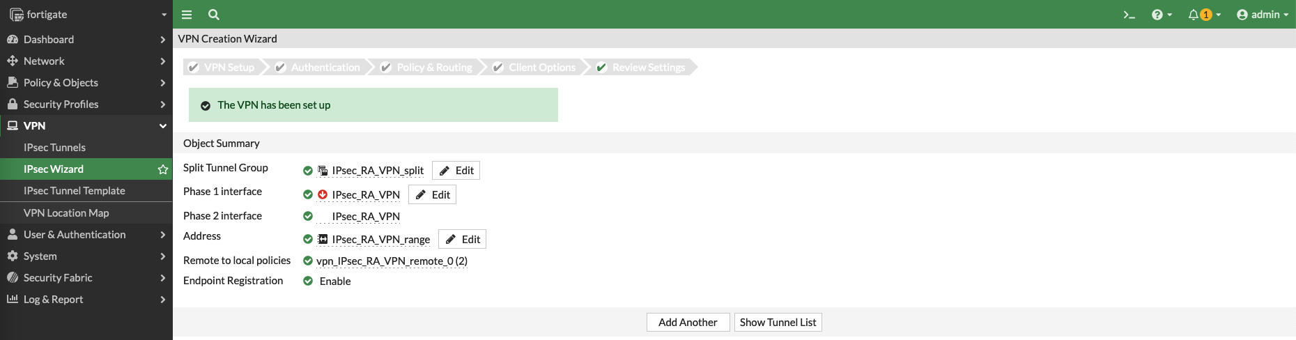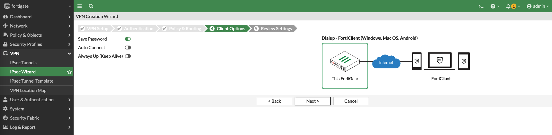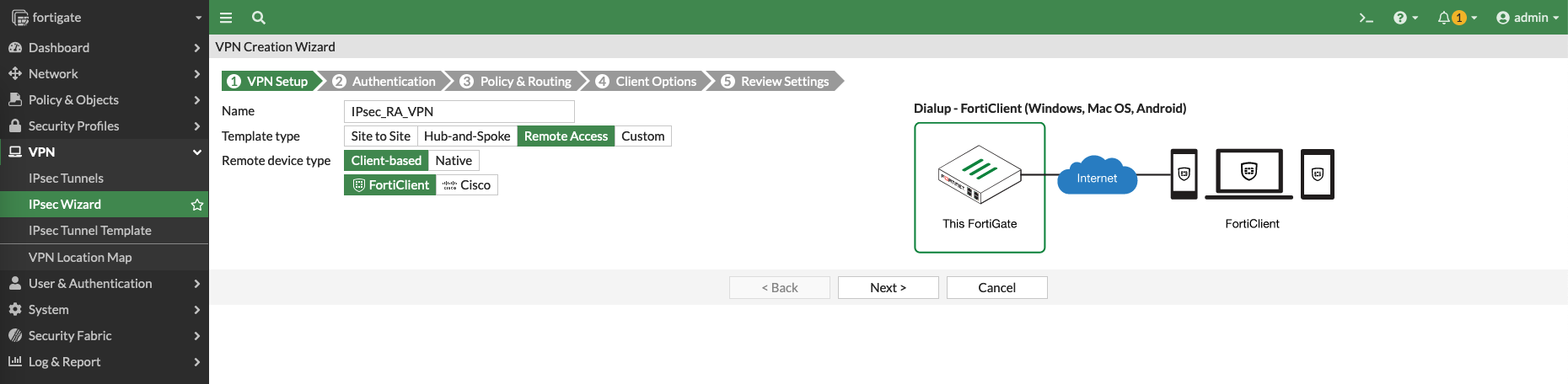 Go to VPN » IPsec Wizard, select the type of Remote Access and the client of Forticlient