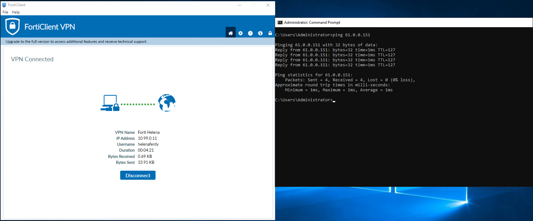 On this client PC, we have a connection to the Forti’s WAN IP but not the inside segment